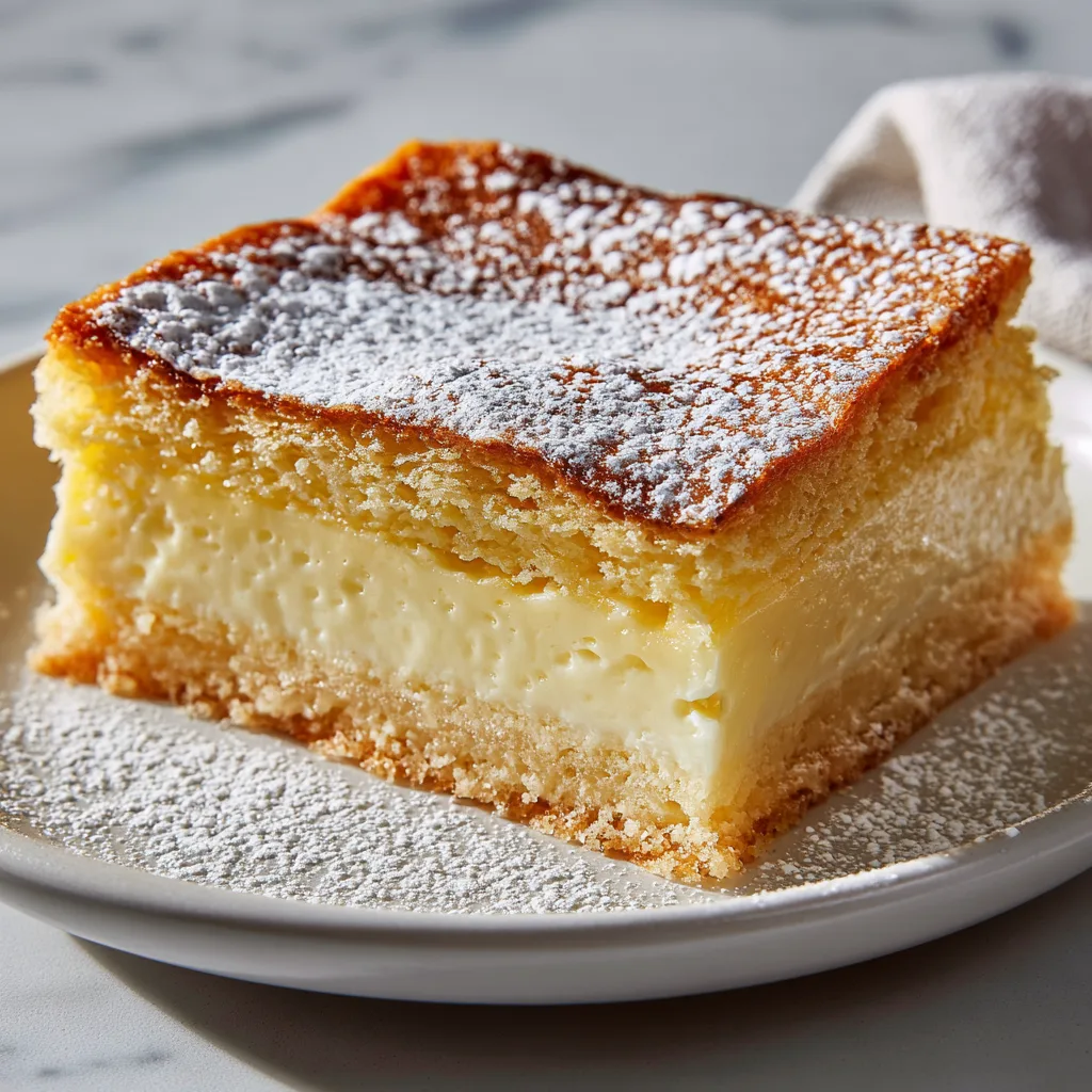 A unique cake made from one batter that magically forms three layers: a fluffy top, creamy custard center, and soft base.