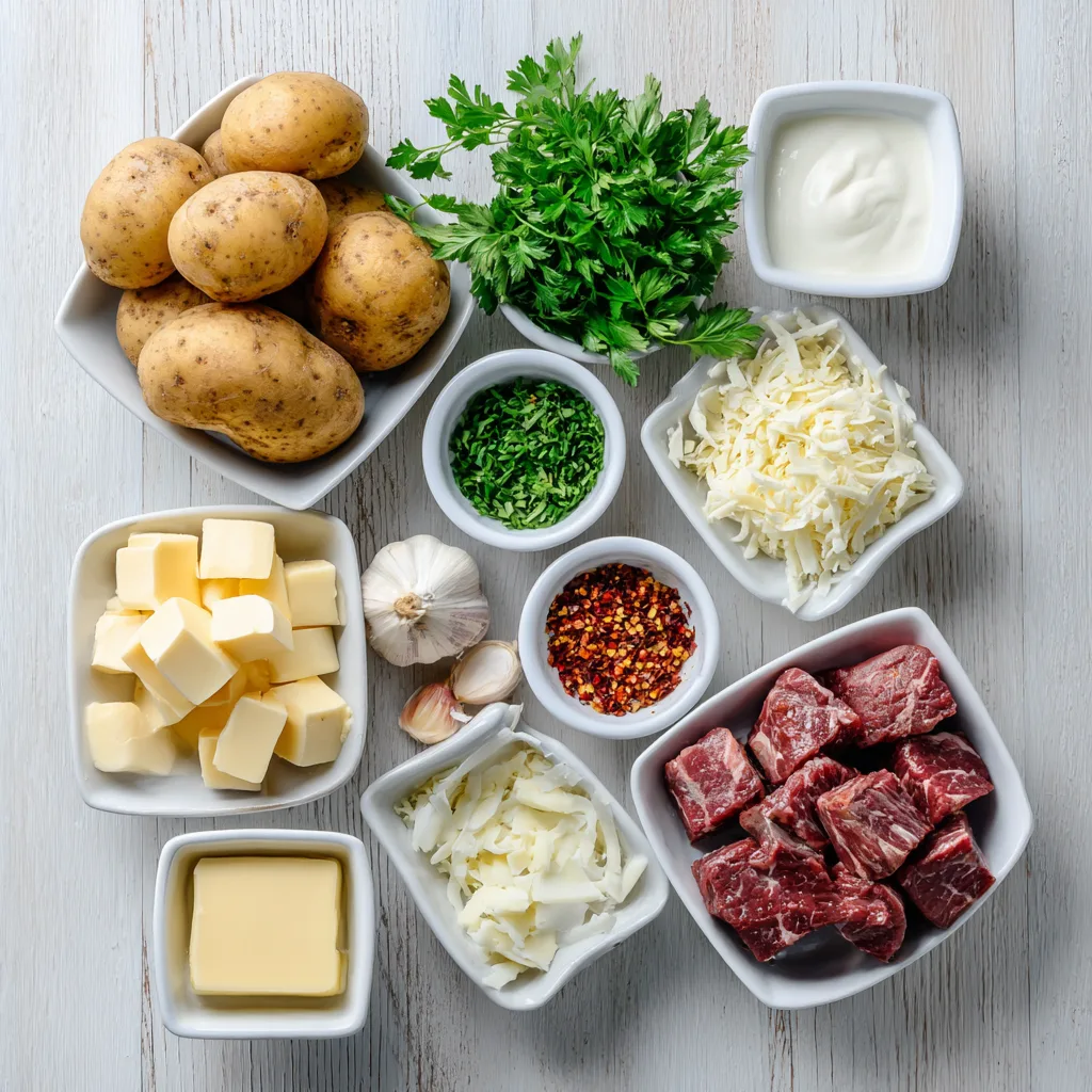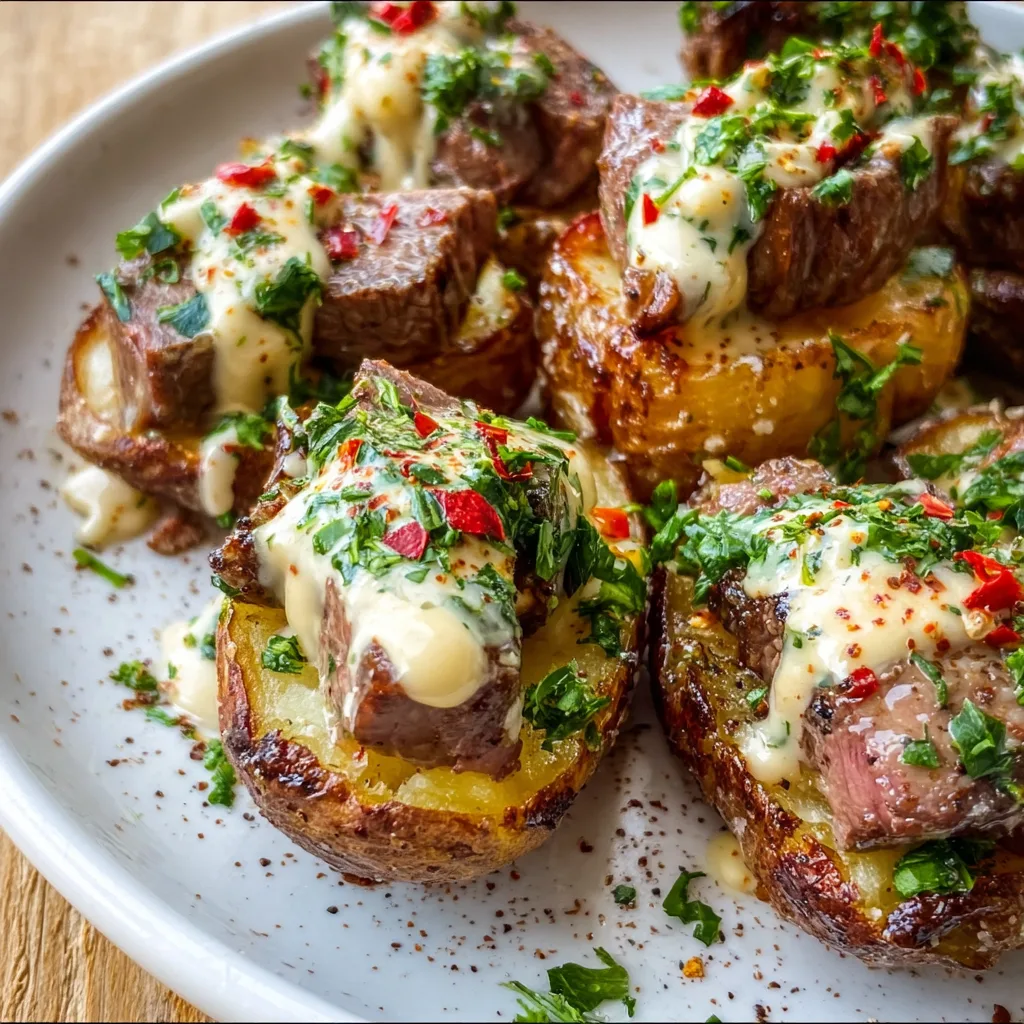 - Top potatoes with steak cubes, drizzle sauce, garnish with parsley and chili flakes.