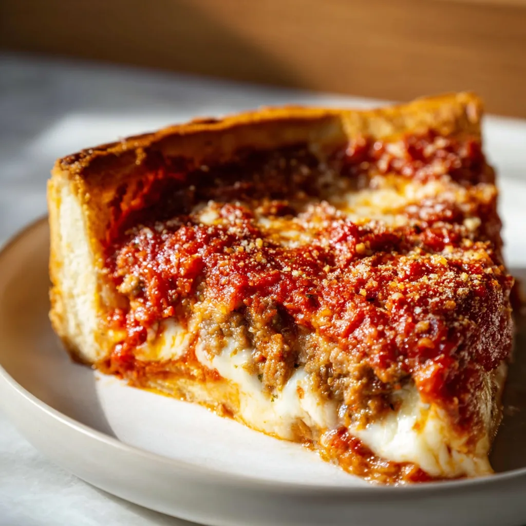 Chicago-style deep dish pizza isn’t just a meal—it’s an event. A towering, hearty, indulgent slice of comfort built in unforgettable layers: a crisp, golden, buttery crust; walls high enough to hold an ocean of gooey mozzarella; rich Italian sausage; and a bright, chunky tomato sauce poured on top like a final flourish. It’s the kind of pizza that demands a fork and knife—and a little patience—but rewards you with some of the most satisfying bites you’ll ever experience.