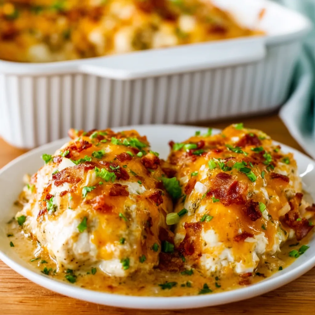 Creamy, cheesy chicken casserole with crispy bacon and ranch seasoning, perfect for a quick and indulgent dinner.