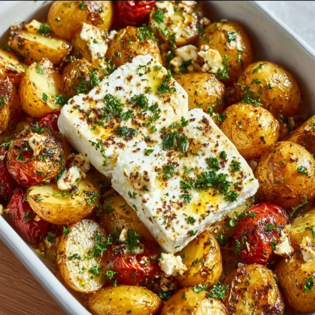 The magic of this recipe lies in contrast. The potatoes roast until golden and crisp on the outside while staying fluffy on the inside. Nestled among them is a block of feta cheese that softens and lightly browns as it bakes, becoming irresistibly creamy without fully melting. As the feta warms, it mingles with olive oil, garlic, and herbs, creating a rich, savory coating for every potato bite.