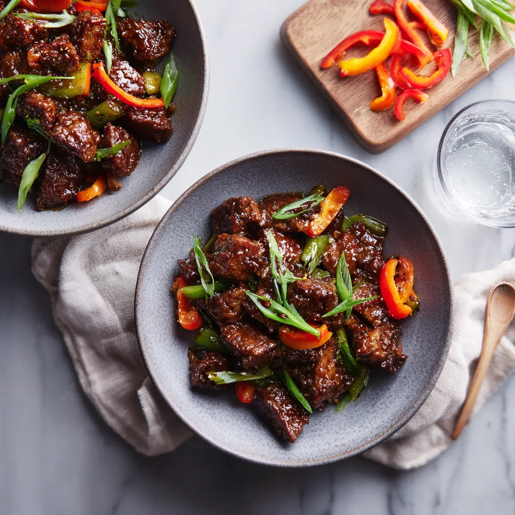 Beijing Beef is a popular Chinese-American dish known for its crispy battered beef slices coated in a sweet, tangy, slightly spicy red sauce. It typically includes red bell peppers and onions for crunch and freshness.