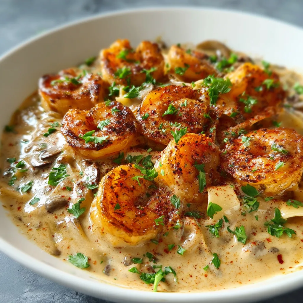 This dish brings together the deep warmth of smoked paprika, cayenne, garlic, and herbs with the silky richness of a classic stroganoff base. Mushrooms, onions, and garlic create an aromatic foundation while butter and sour cream build the luxurious sauce that coats every bite. Instead of beef, shrimp take center stage—seared over high heat until blackened at the edges, tender in the middle, and bursting with smoky, savory flavor.