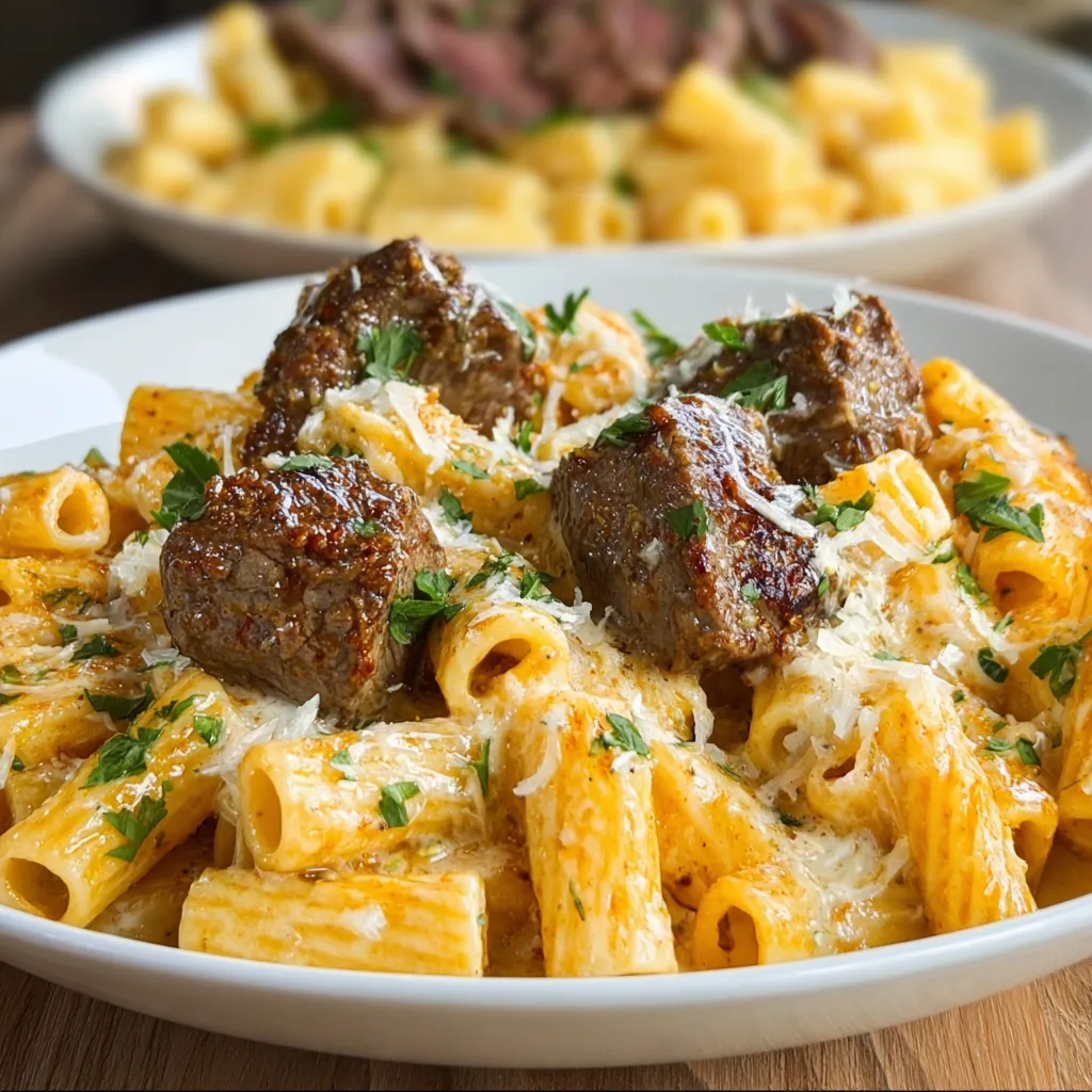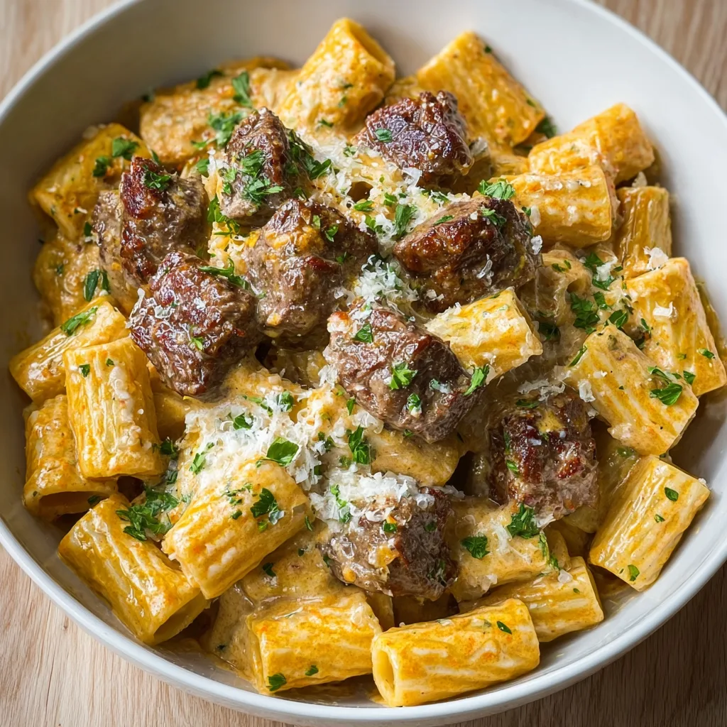 This dish is built on two irresistible components: tender, perfectly seasoned steak tips and a velvety parmesan sauce that clings beautifully to each tube of rigatoni. The steak brings smoky flavor and juicy texture, while the sauce adds decadence without being overly heavy. Every bite hits that perfect trifecta—creamy, spicy, and savory.