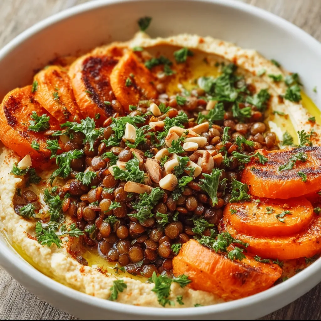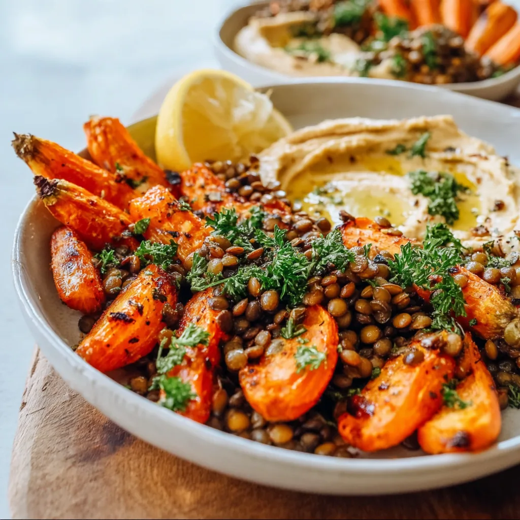 The beauty of this bowl is that it balances flavors and textures effortlessly. The caramelized carrots bring sweetness, the lentils add protein and earthiness, and the creamy hummus ties everything together with a subtle tang of lemon juice and olive oil. Finished with fresh herbs and a sprinkle of toasted nuts, every bite is hearty, satisfying, and vibrant.