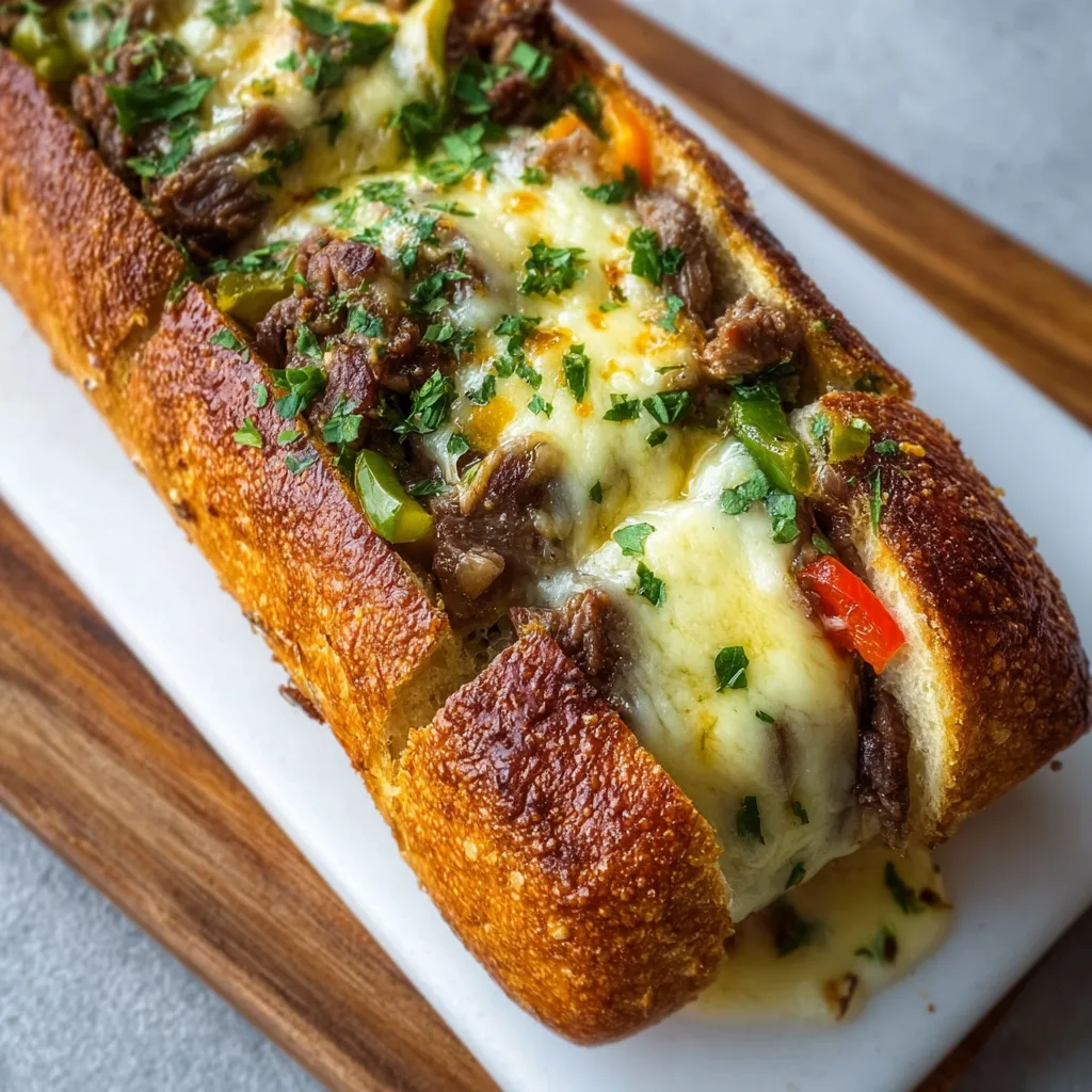 A buttery garlic bread loaf stuffed with tender steak, peppers, onions, and melted cheese.