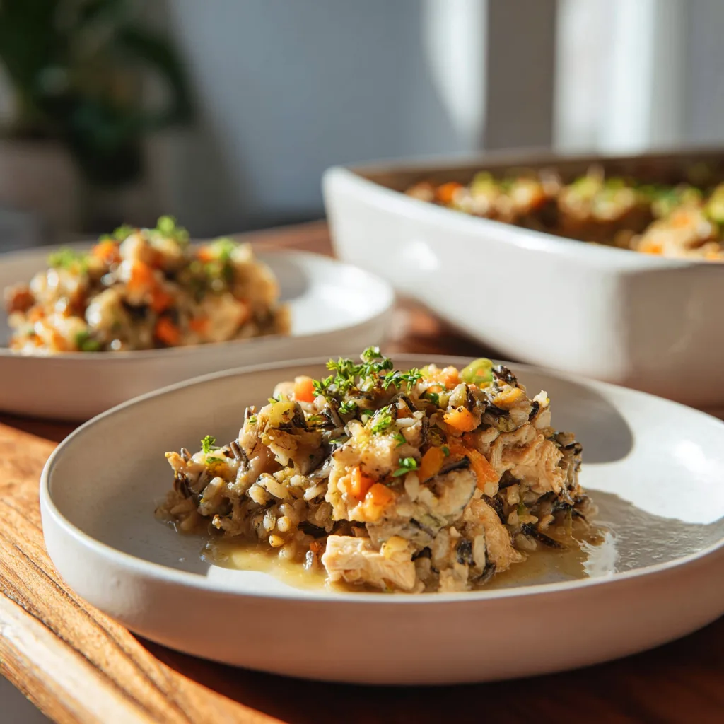 A creamy, hearty casserole featuring wild rice, mushrooms, chicken, and a rich savory sauce. Cozy, comforting, and perfect for family dinners.