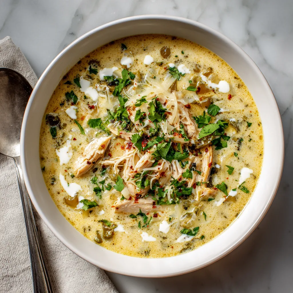 A creamy, cheesy soup inspired by chile rellenos with roasted poblano peppers and tender chicken.