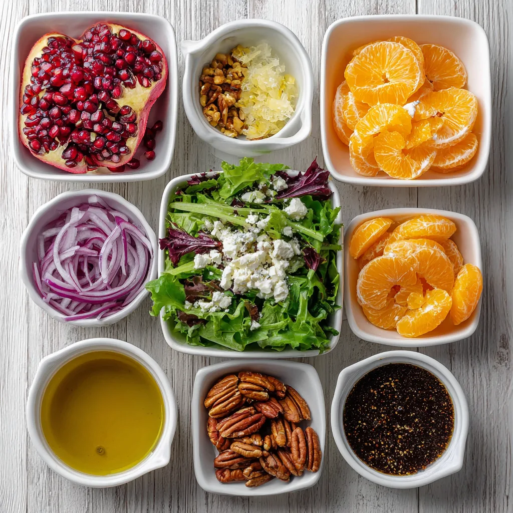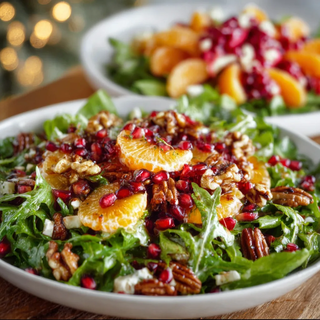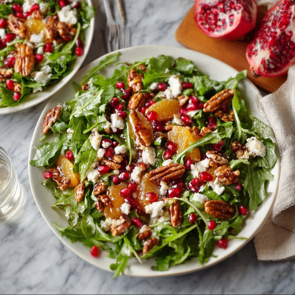 Imagine starting your holiday meal with something crisp and bright after a day of baking cookies or simmering creamy casseroles. The first bite is refreshing: tender greens dressed in a silky vinaigrette, juicy pops of pomegranate, the sunny sweetness of oranges, creamy feta, and the buttery crunch of toasted pecans. It’s a salad that tastes like winter — cool, balanced, and full of contrasting textures.