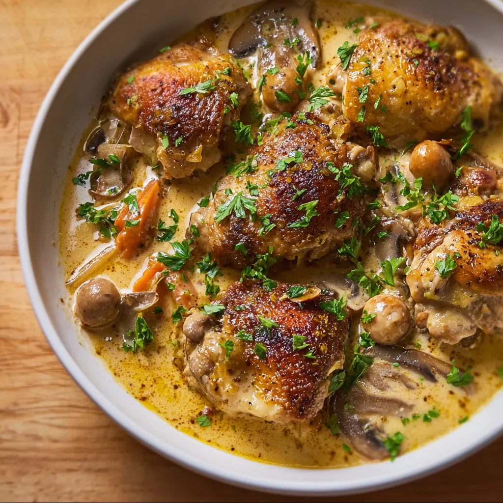 Rooted in the Alsace region of eastern France, Coq au Riesling reflects the area’s unique culinary identity—French at its core, yet deeply influenced by neighboring Germany. Instead of red wine, Riesling takes center stage, lending delicate acidity and subtle fruitiness that pairs beautifully with chicken, mushrooms, and herbs. The result is a dish that feels rustic yet refined, perfect for Sunday lunches, cozy winter dinners, or anytime you want something deeply satisfying but not heavy.