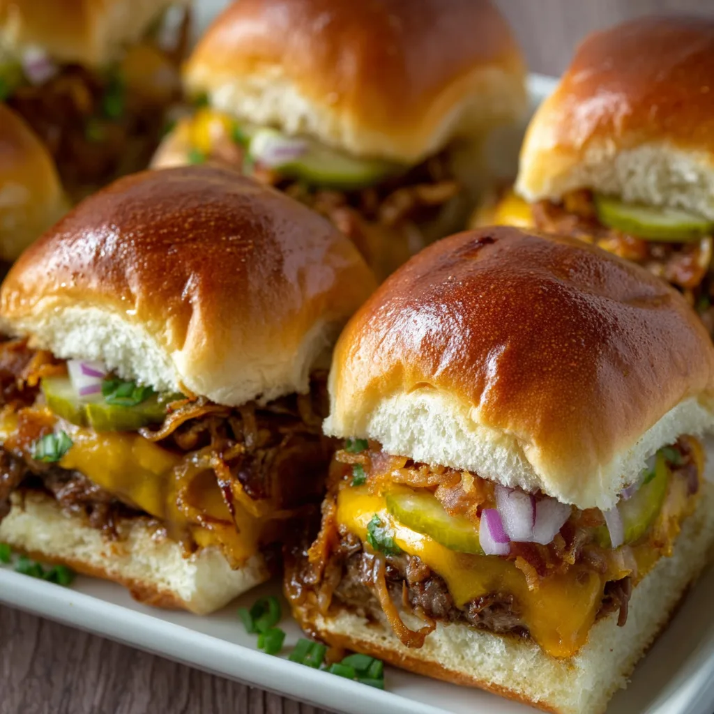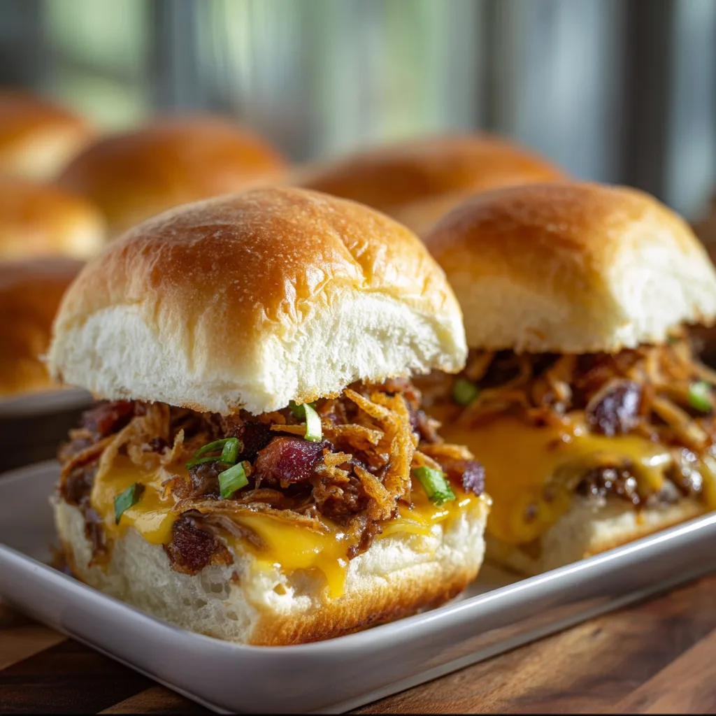Picture thick mini beef patties sizzling in a hot pan, the fat rendering down to create that irresistible crust. The cheddar melts in gorgeous, glossy ribbons over the meat, dripping slightly off the sides. Add in smoky bacon for crunch, crispy fried onions for texture, tangy pickles for balance, and a BBQ mayo that ties everything together with creamy sweetness and a hint of heat — and you’ve got sliders that taste like a backyard cookout, a rodeo, and a campfire supper all wrapped into one perfect handheld bite.