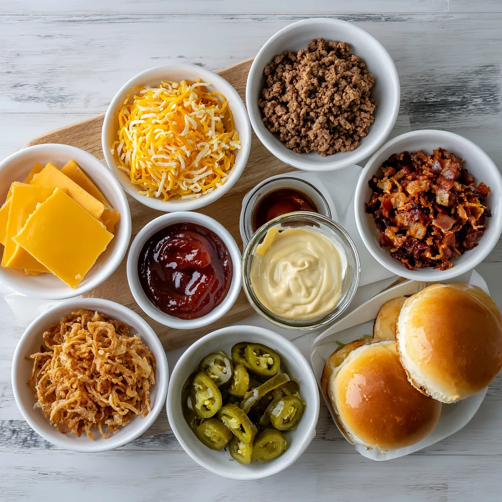 - Assemble sliders with sauce, patties, bacon, fried onions, and pickles.