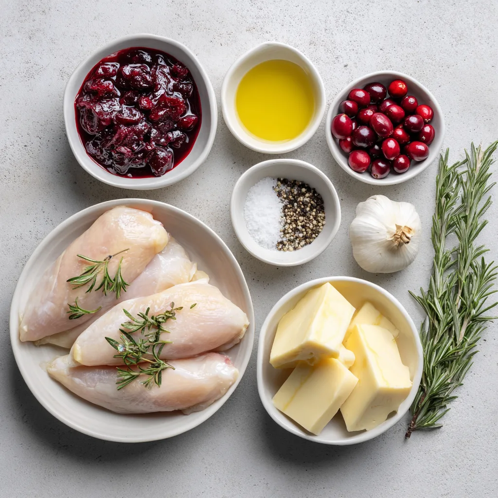 - Stuff the chicken: Spoon a tablespoon or two of cranberry sauce into each pocket, then tuck in a few slices of brie. Sprinkle a pinch of chopped rosemary inside each one. Secure the edges with toothpicks if needed.