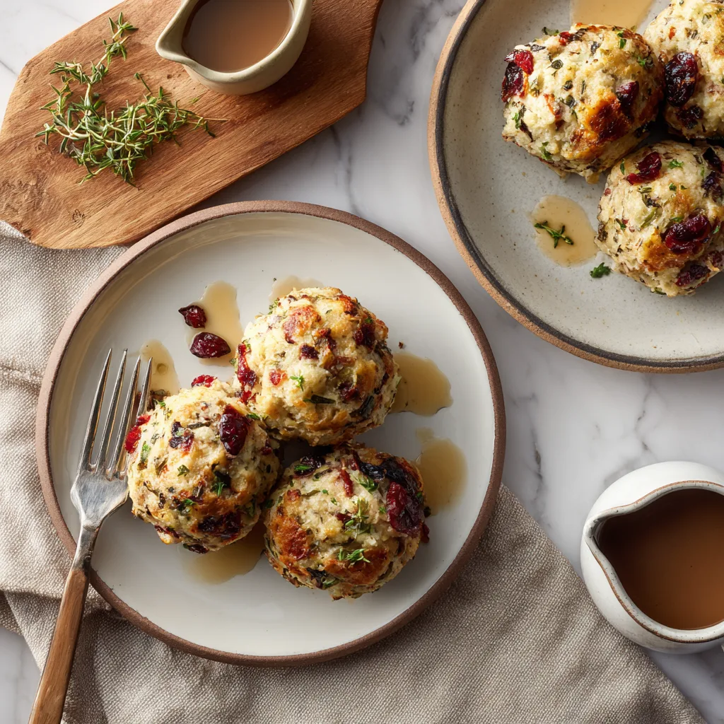 Savory baked stuffing balls made with turkey, herbs, and dried cranberries — perfect for holiday dinners or festive appetizers.