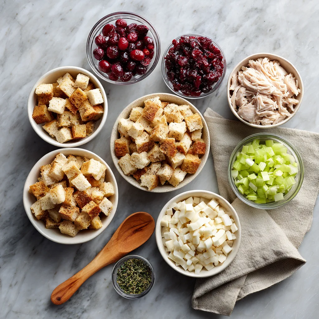 3. In a large mixing bowl, combine the cubed bread, cooked turkey, dried cranberries, thyme, sage, rosemary, salt, and pepper.