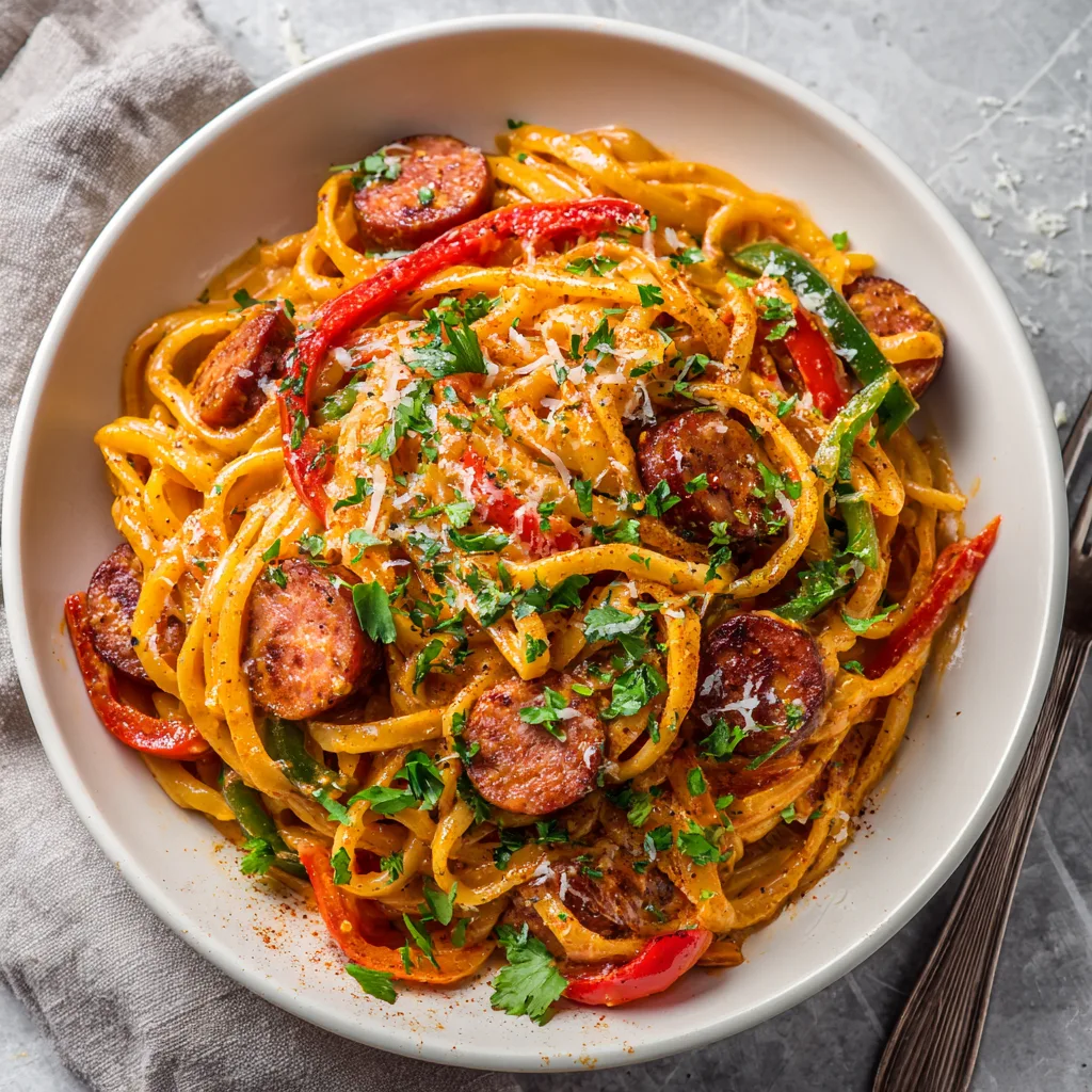 A bold and creamy Cajun pasta made with smoky sausage, bell peppers, and a rich spiced cream sauce — ready in just 30 minutes.