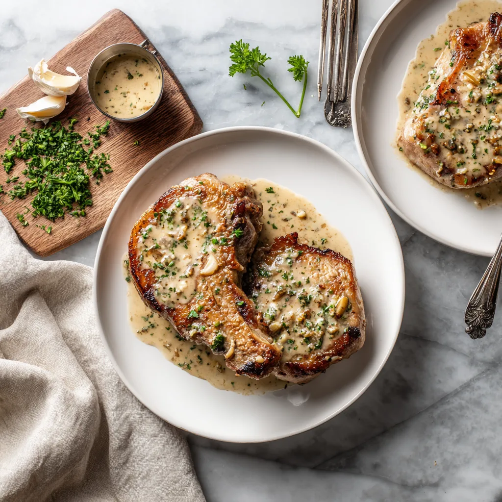 Juicy pan-seared pork chops simmered in a rich and creamy garlic sauce, ready in just 30 minutes.