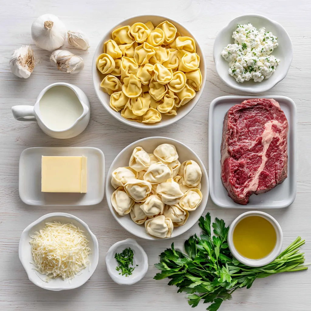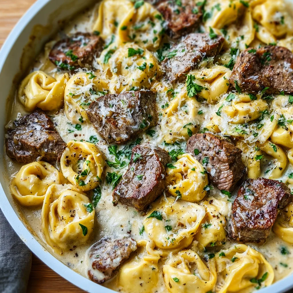 A rich one-pan dinner with seared steak, cheese tortellini, and a silky garlic Parmesan cream sauce.