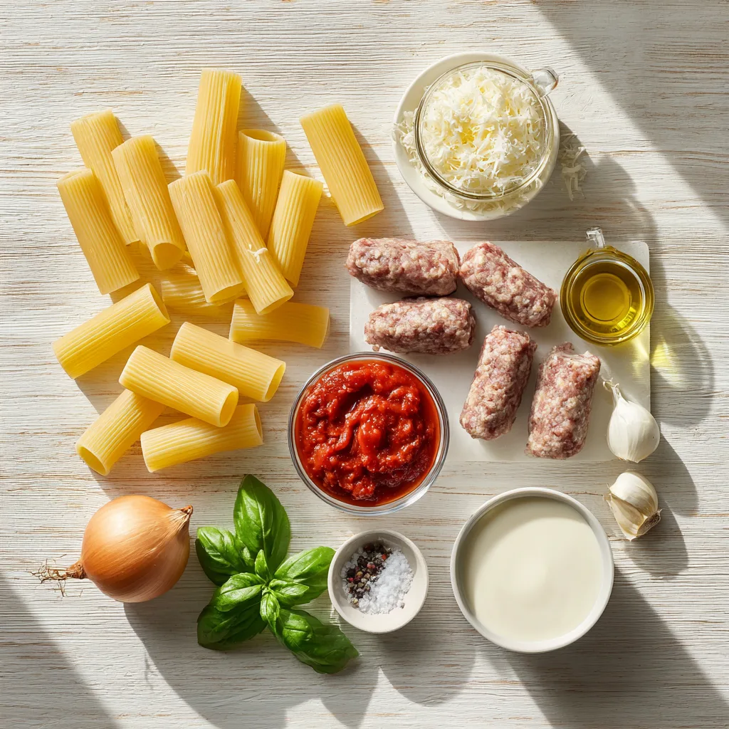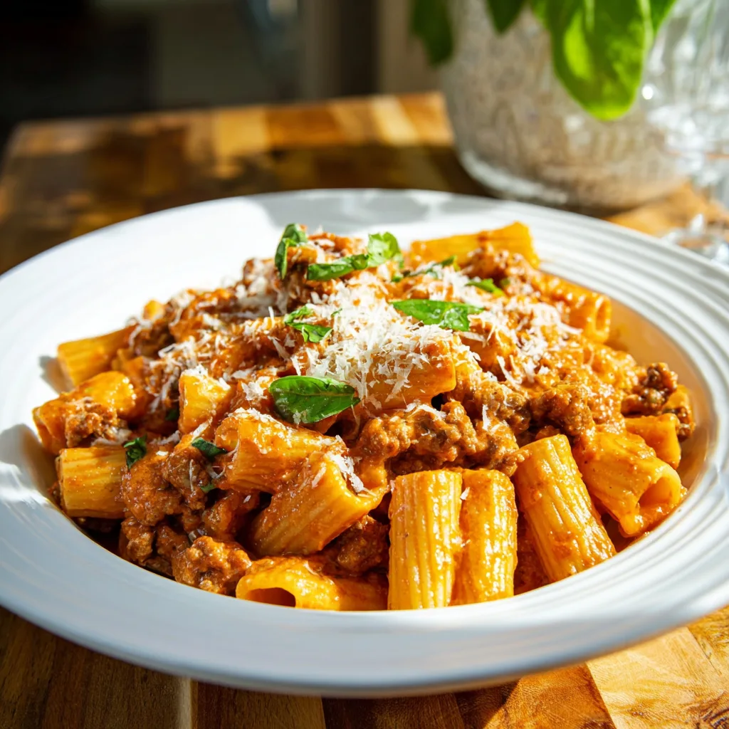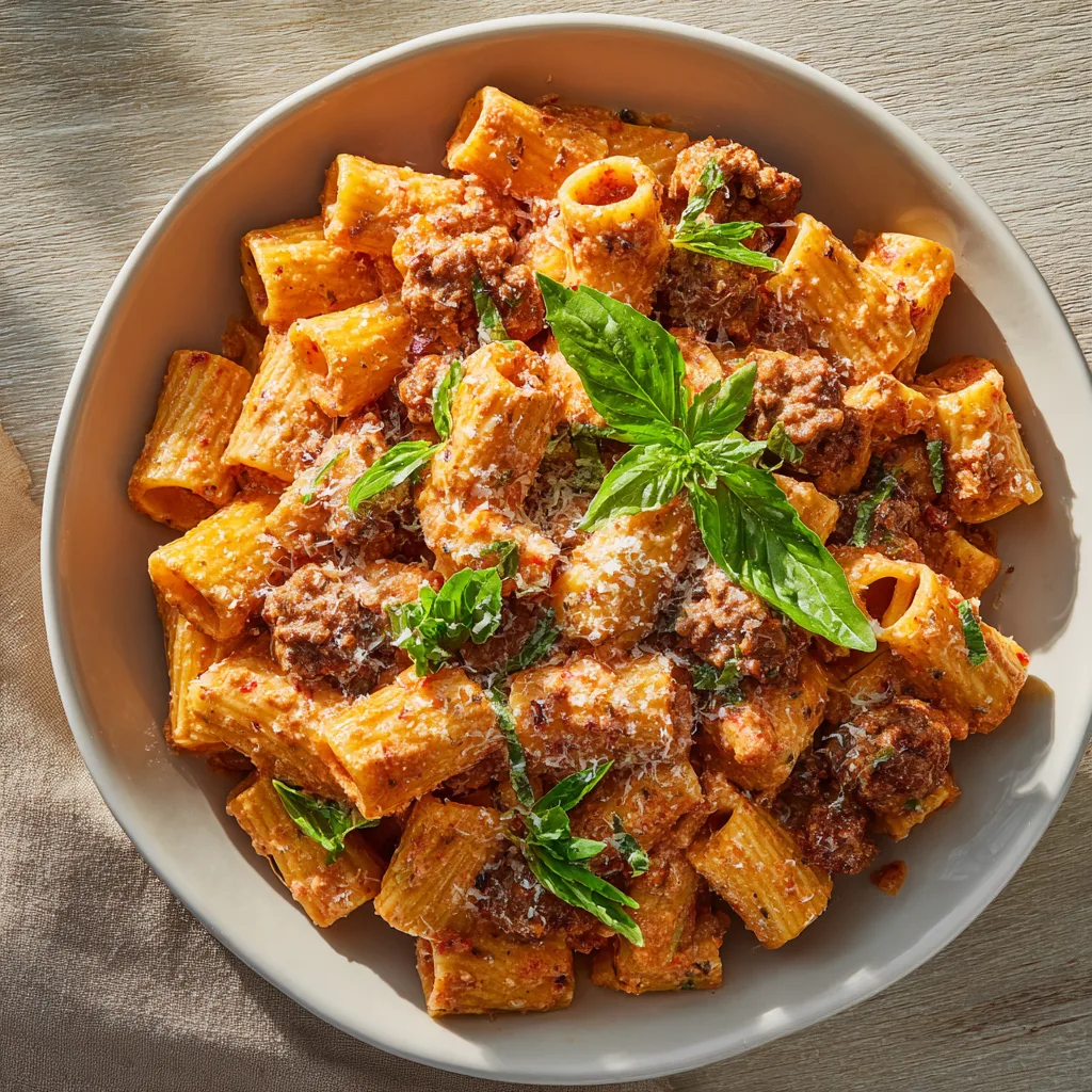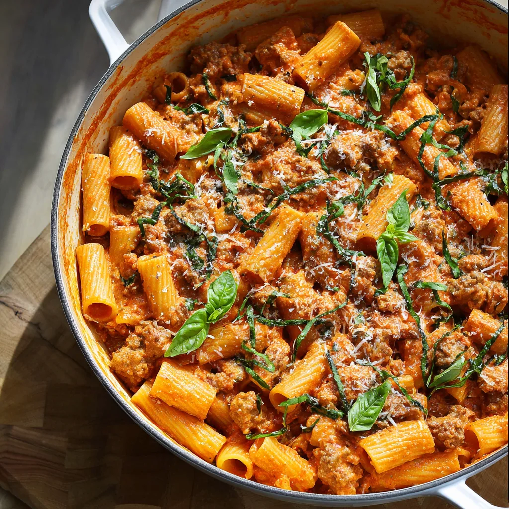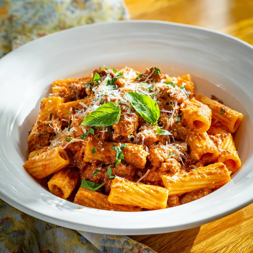 Hearty rigatoni pasta tossed in a creamy tomato sauce with savory Italian sausage, Parmesan, and fresh herbs.