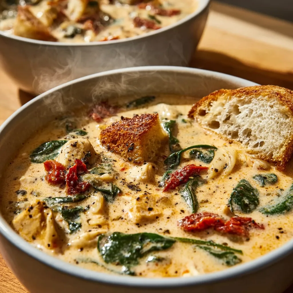 This is the kind of soup that feels special from the very first spoonful. The broth is silky and flavorful, layered with garlic, herbs, and savory Parmesan. Tender chicken pieces soak up all that goodness, while sun-dried tomatoes add bursts of tangy sweetness that cut through the creaminess perfectly. A handful of fresh spinach wilts into the soup at the end, adding color, freshness, and balance.