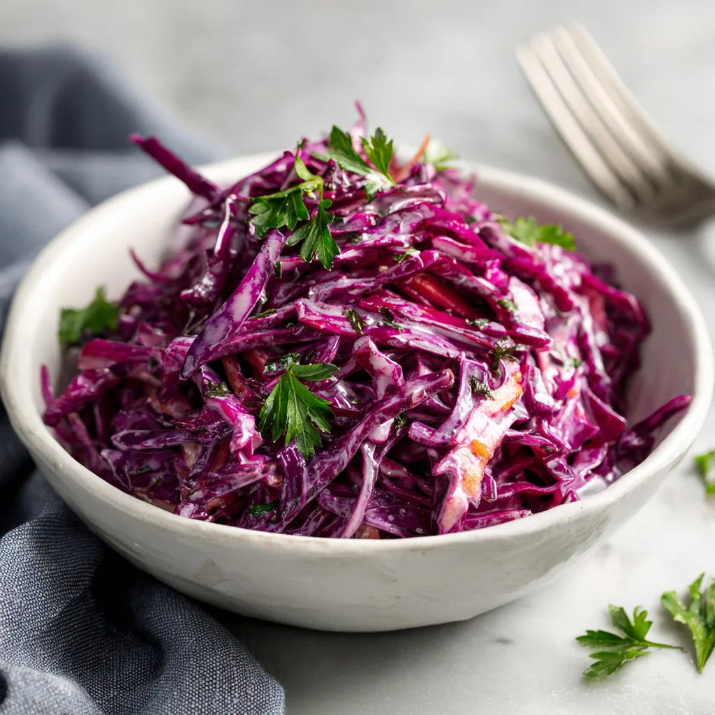 There’s something undeniably beautiful about a bowl of bright purple cabbage tossed in a creamy dressing. It feels fresh. It feels vibrant. And somehow, it instantly makes any meal look more inviting.