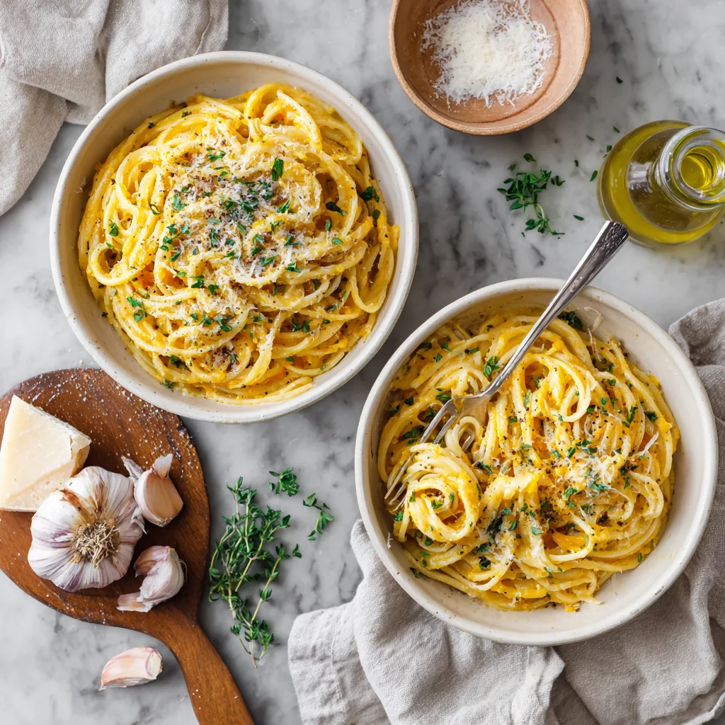 A cozy pasta dish featuring roasted butternut squash and garlic blended into a creamy, flavorful sauce.