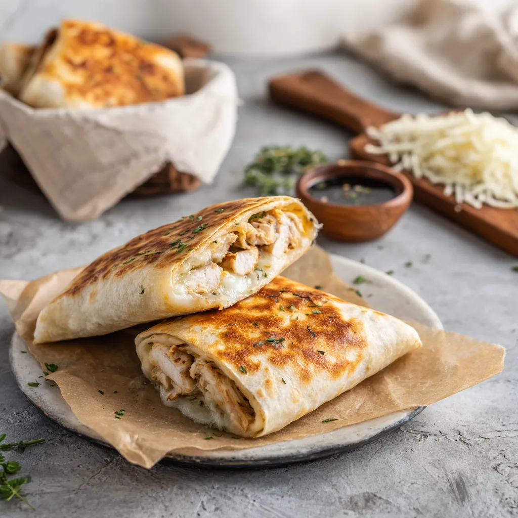 Golden crispy air fryer wraps filled with seasoned chicken and melted mozzarella, perfect for a quick lunch or dinner.