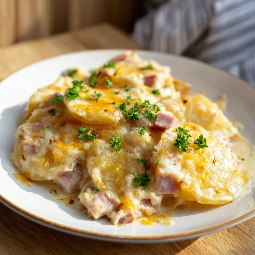 A creamy, comforting slow cooker dish with layers of tender potatoes, savory ham, and rich cheese sauce.