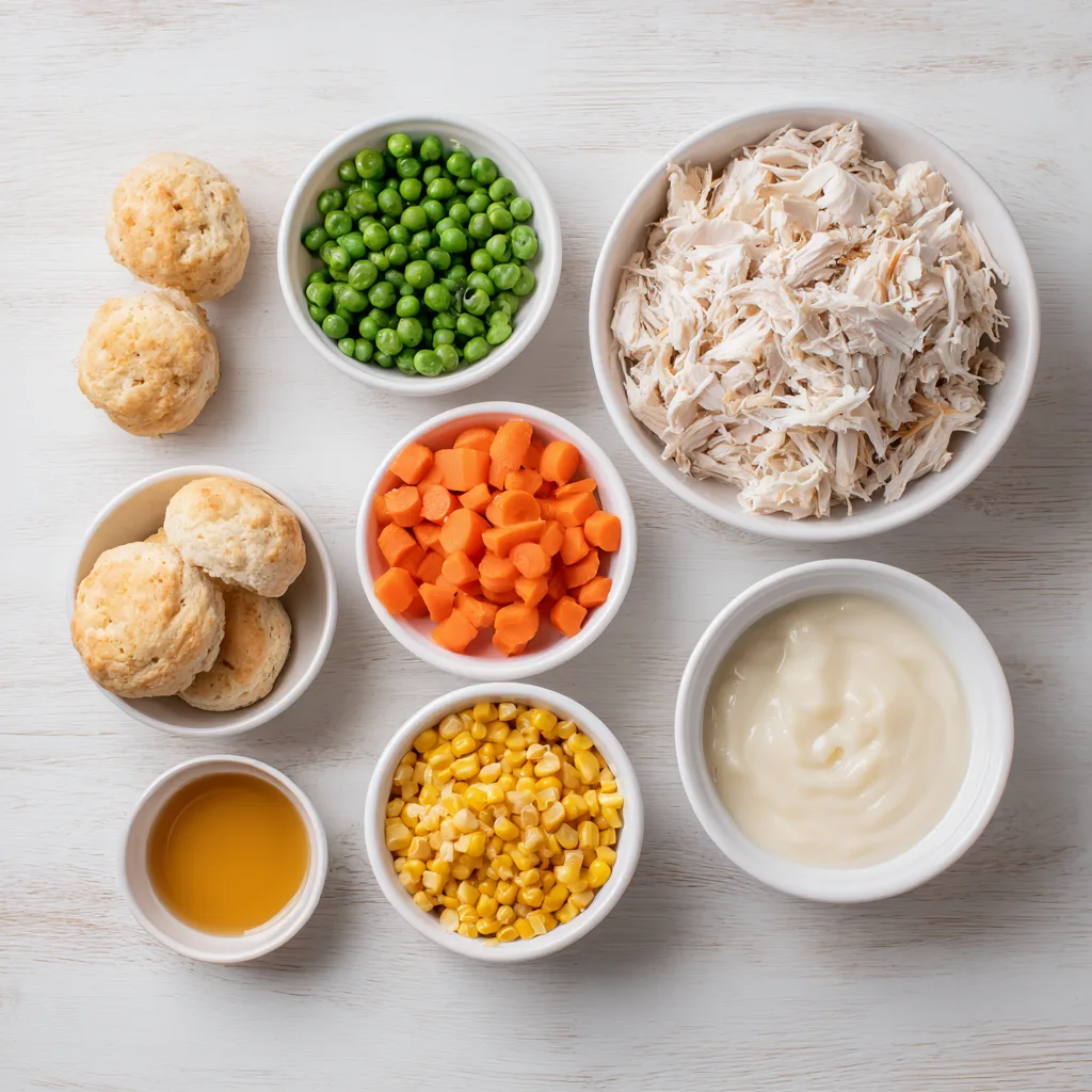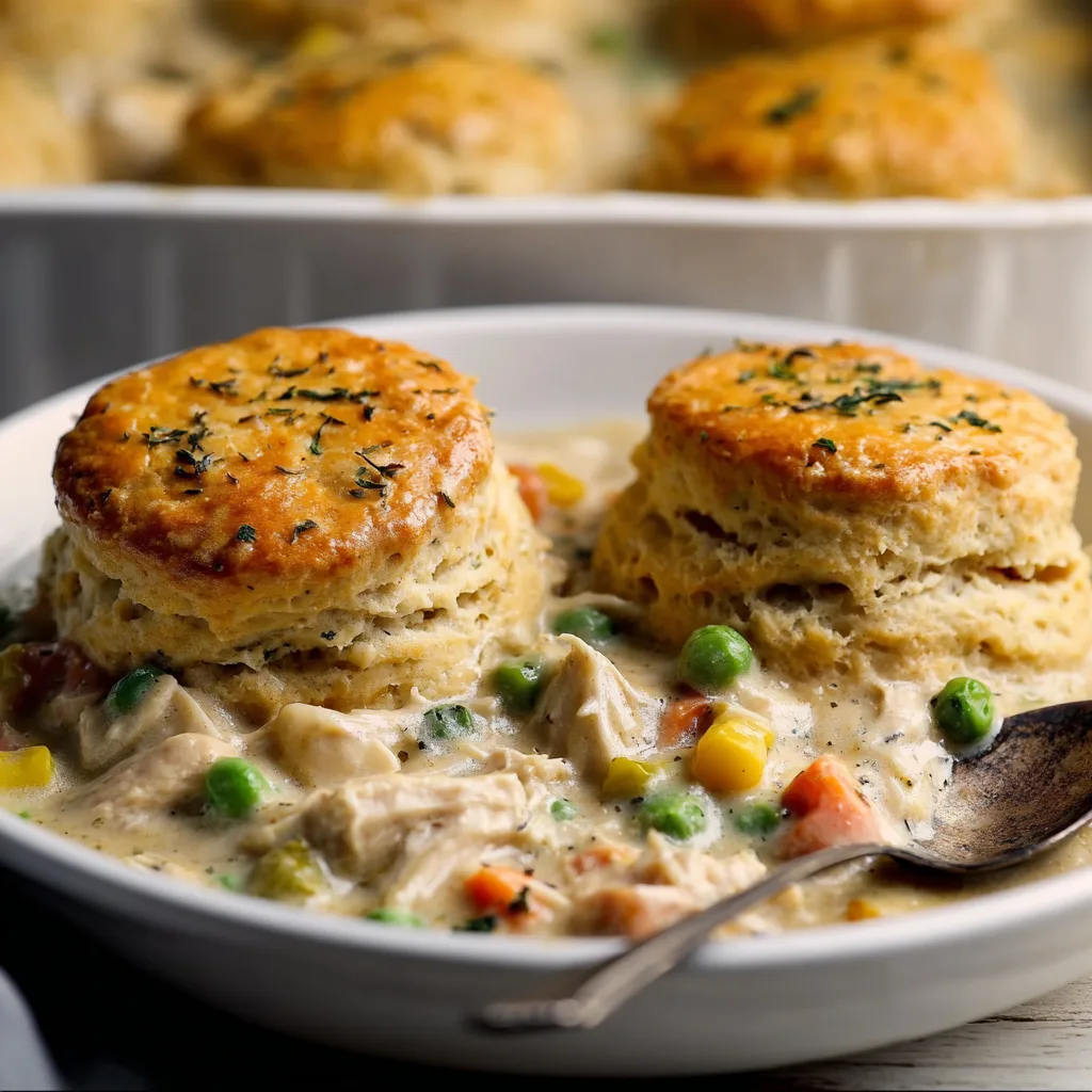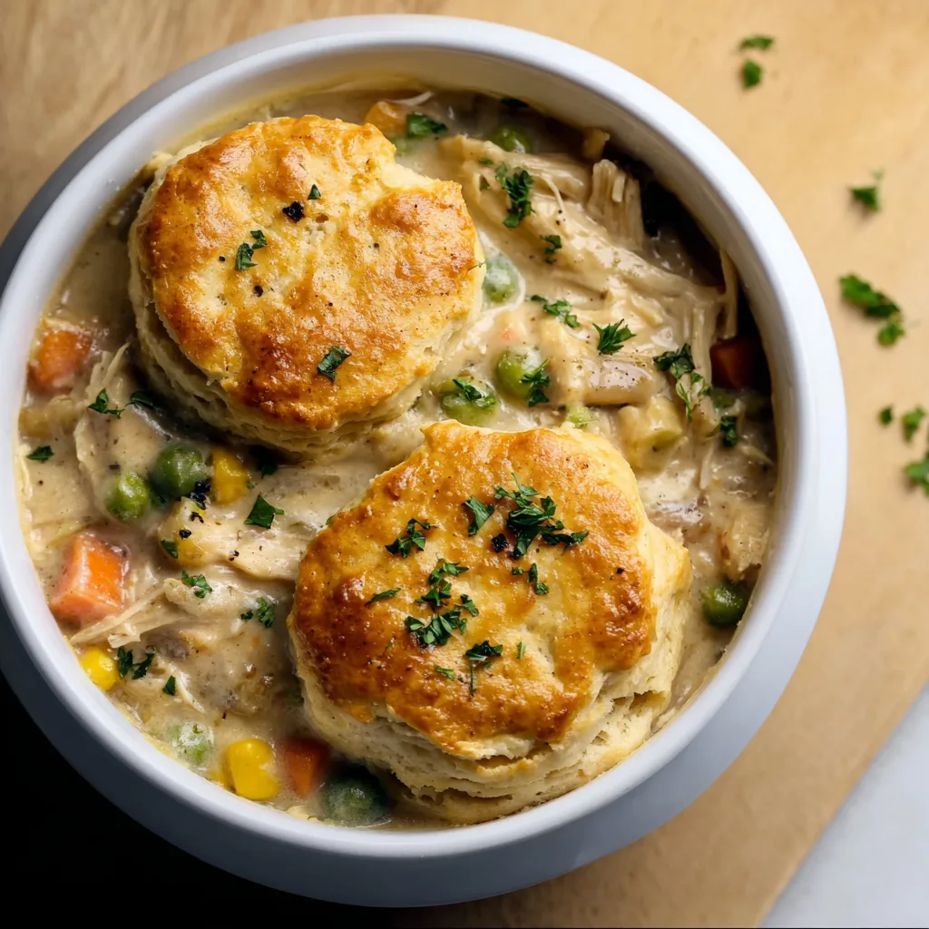 This recipe keeps all the flavors of classic pot pie—tender chicken, hearty vegetables, and rich, creamy sauce—but trades the pie crust for fluffy golden biscuits that bake separately and get nestled on top just before serving. Each spoonful feels like a warm hug: creamy sauce, perfectly shredded chicken, and soft vegetables with the buttery crunch of biscuit topping.