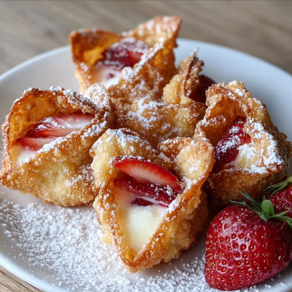 Crispy wontons filled with creamy cheesecake and fresh strawberries, fried golden and dusted with powdered sugar.