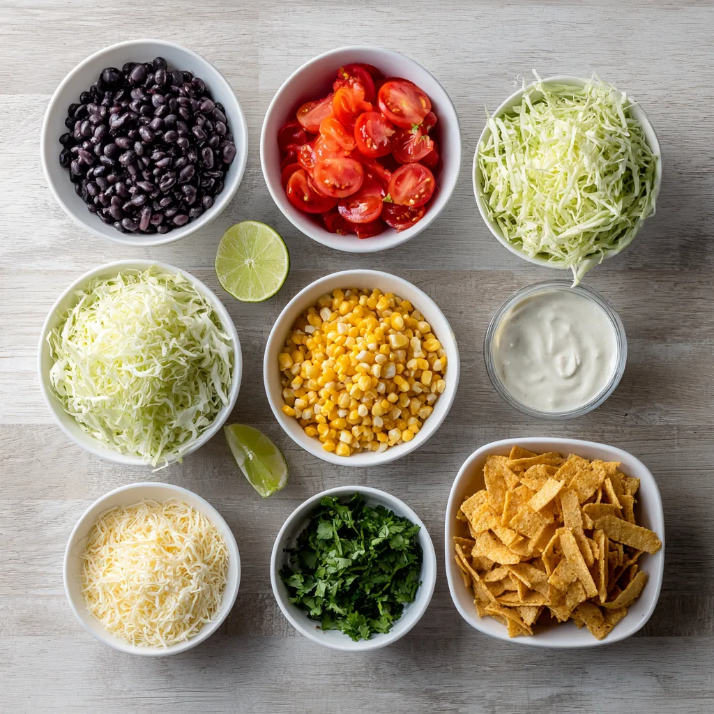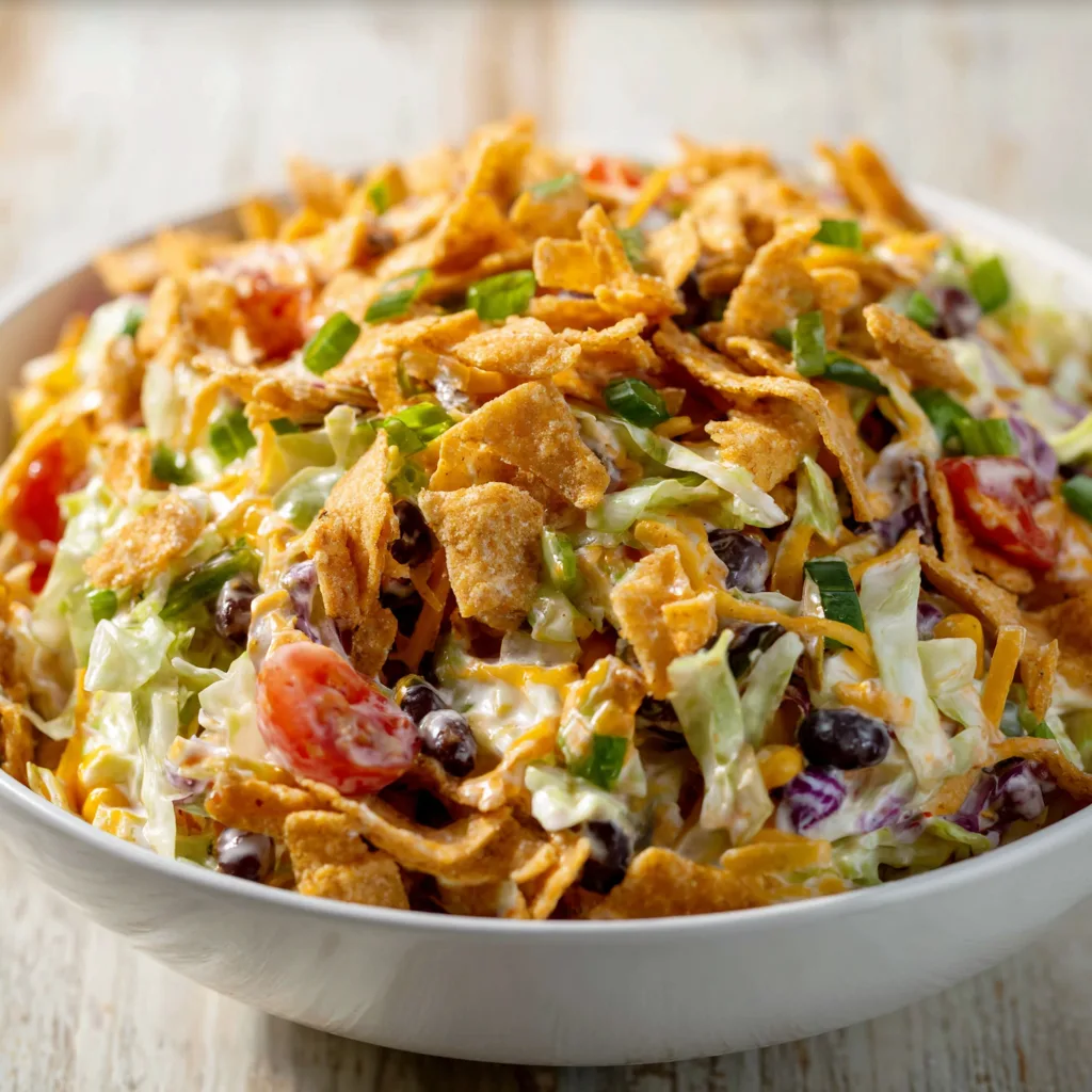 If you’ve ever had Frito pie, taco salad, or cowboy caviar, this recipe fits right into that family — bold, bright, satisfyingly crunchy, and layered with flavors you can customize endlessly. What makes this salad especially appealing is how quickly it comes together. With minimal prep, a handful of pantry staples, and just a few fresh ingredients, you create a salad that tastes like it came out of a diner, a barbecue joint, or a backyard potluck.