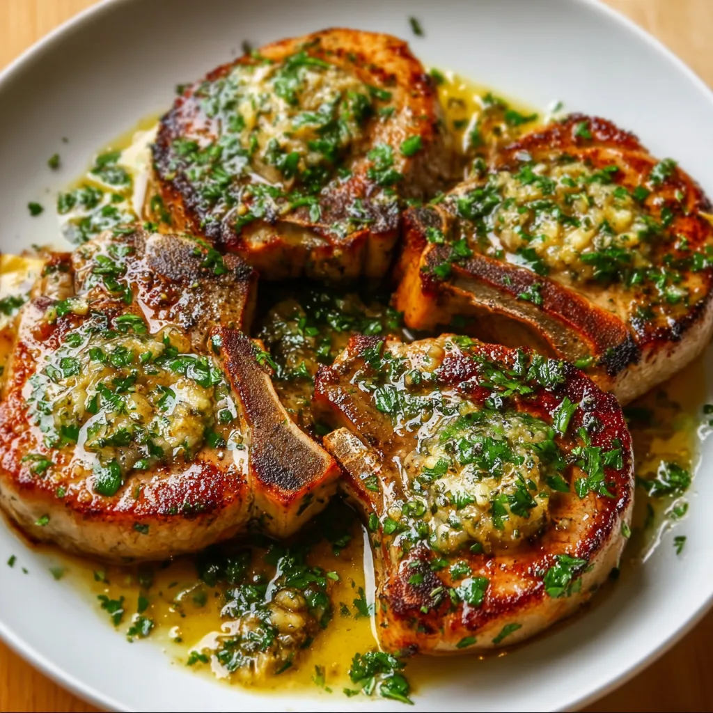 - Return pork chops to pan, spoon garlic butter over them, and garnish with parsley before serving.