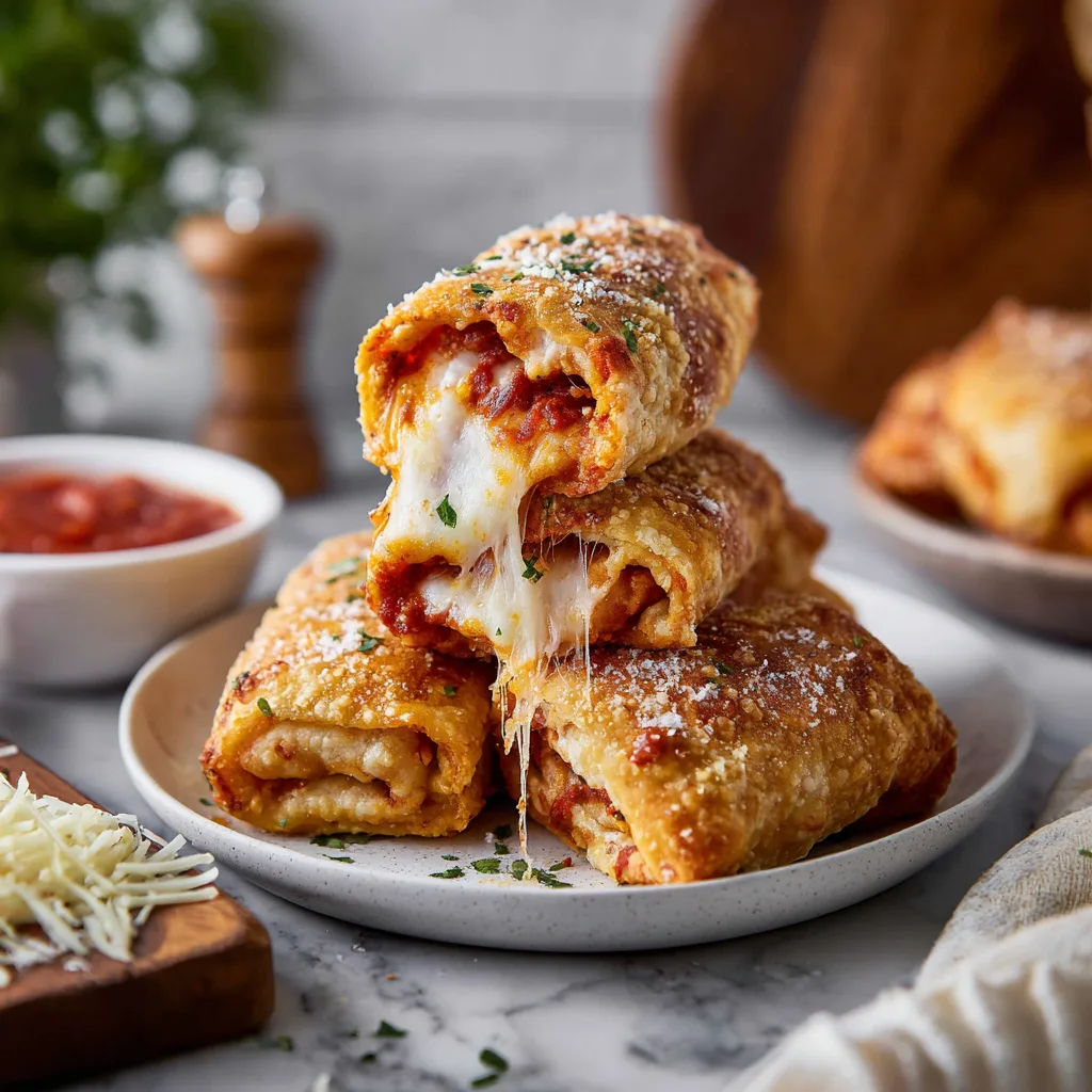 Soft pizza rolls filled with marinara, mozzarella, and pepperoni, baked until golden and brushed with garlic Parmesan butter.
