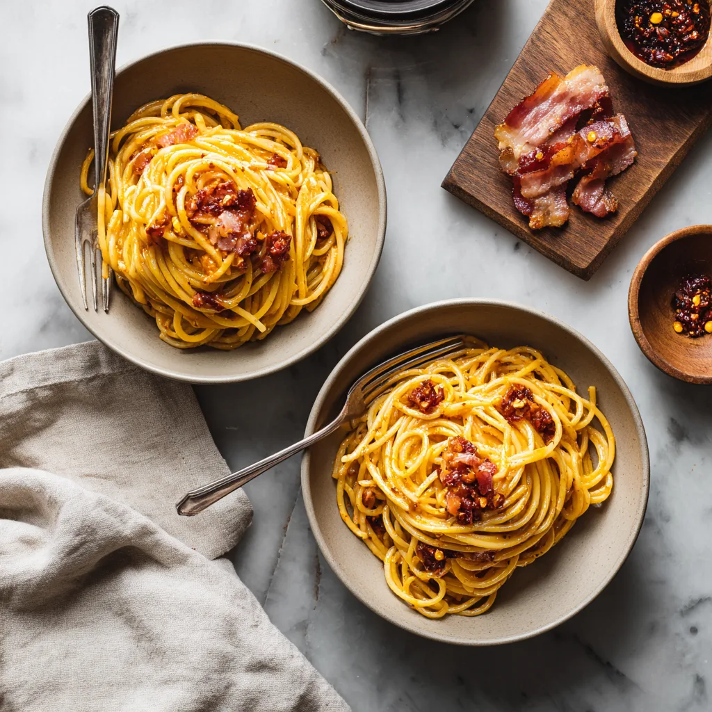 A creamy, spicy fusion pasta that combines traditional Italian carbonara with Korean gochujang chili paste for bold flavor.