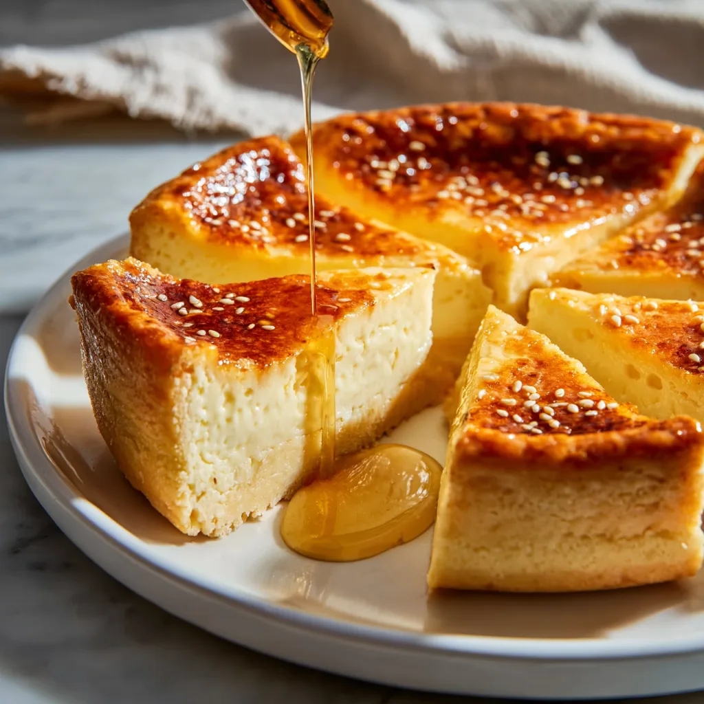A traditional Greek honey and cheese pie with a creamy custard-like texture and golden finish.