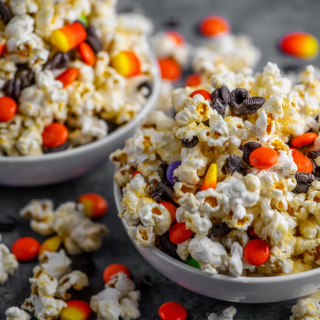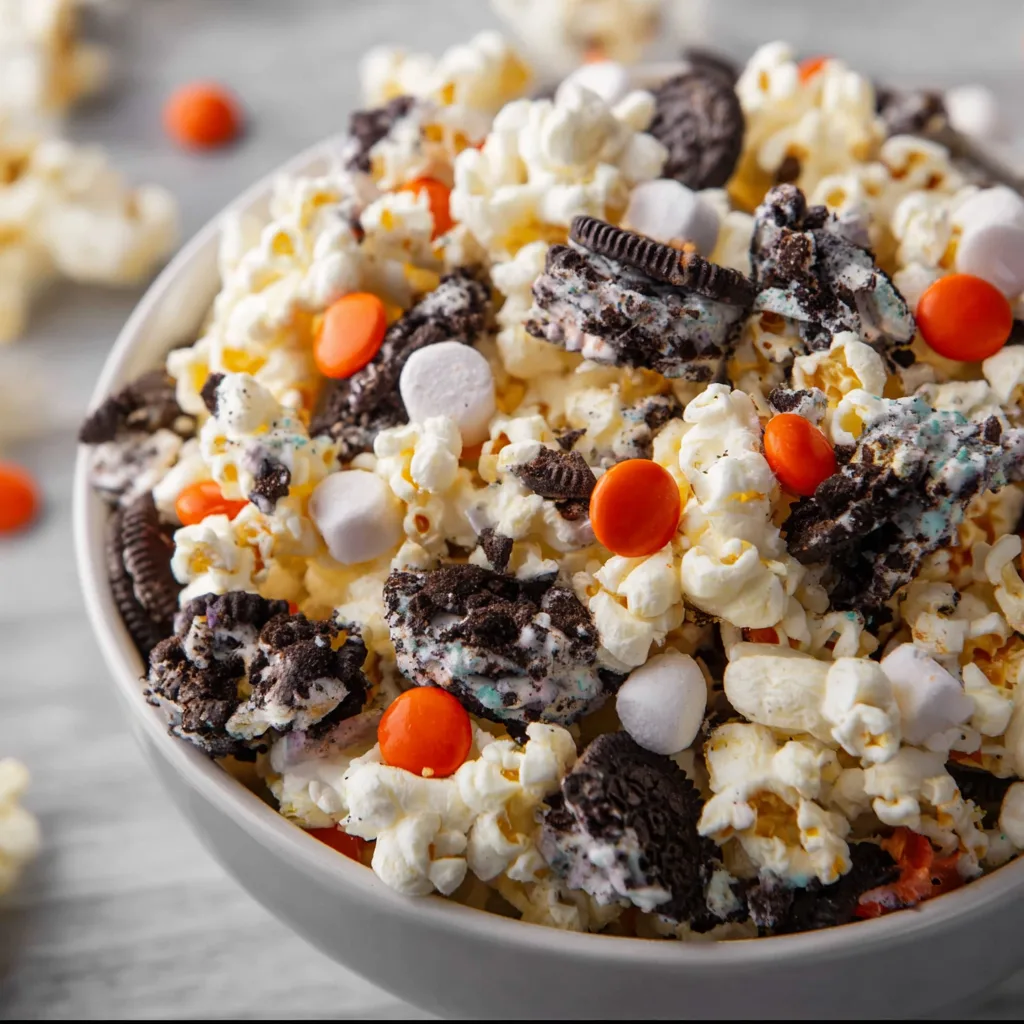 It’s the kind of recipe that doesn’t just taste delicious—it brings people together. Imagine a big bowl of popcorn drizzled with melted chocolate, tossed with crunchy Oreos, mini marshmallows, and vibrant candy-coated chocolates in festive fall colors. Every handful is a delightful mix of sweet and salty, crunchy and chewy.
