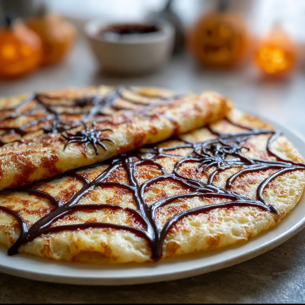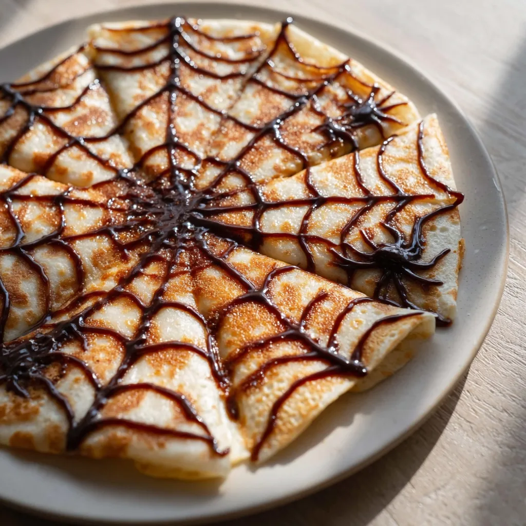 - Decorate Spiderwebs: Use chocolate syrup in a squeeze bottle to draw spiderweb patterns on the crepes. Start with concentric circles and drag a toothpick outward to create the web effect.