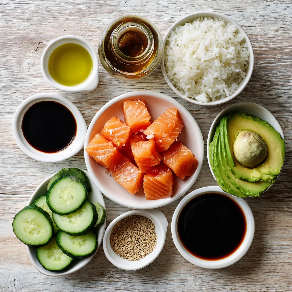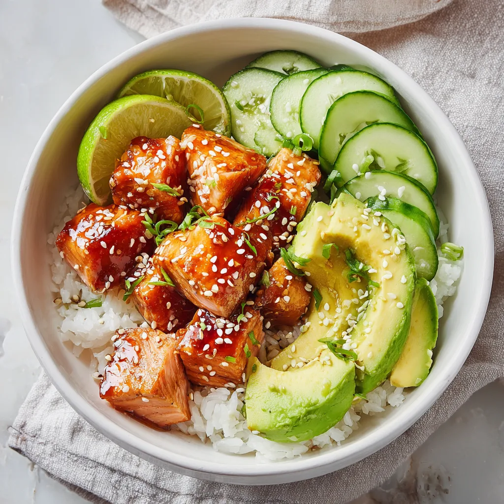 Sweet and savory salmon cubes glazed in honey soy sauce, served over fluffy rice with avocado and cucumber.