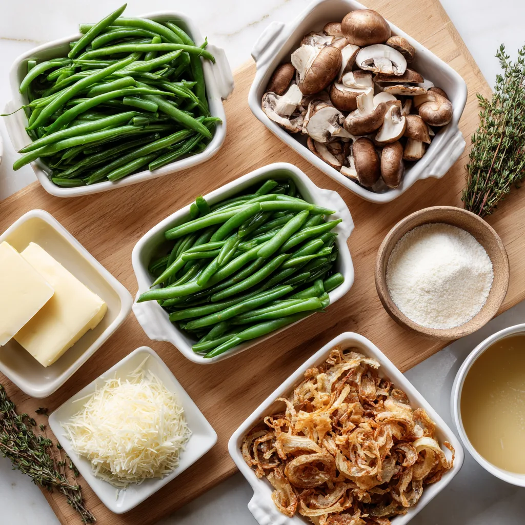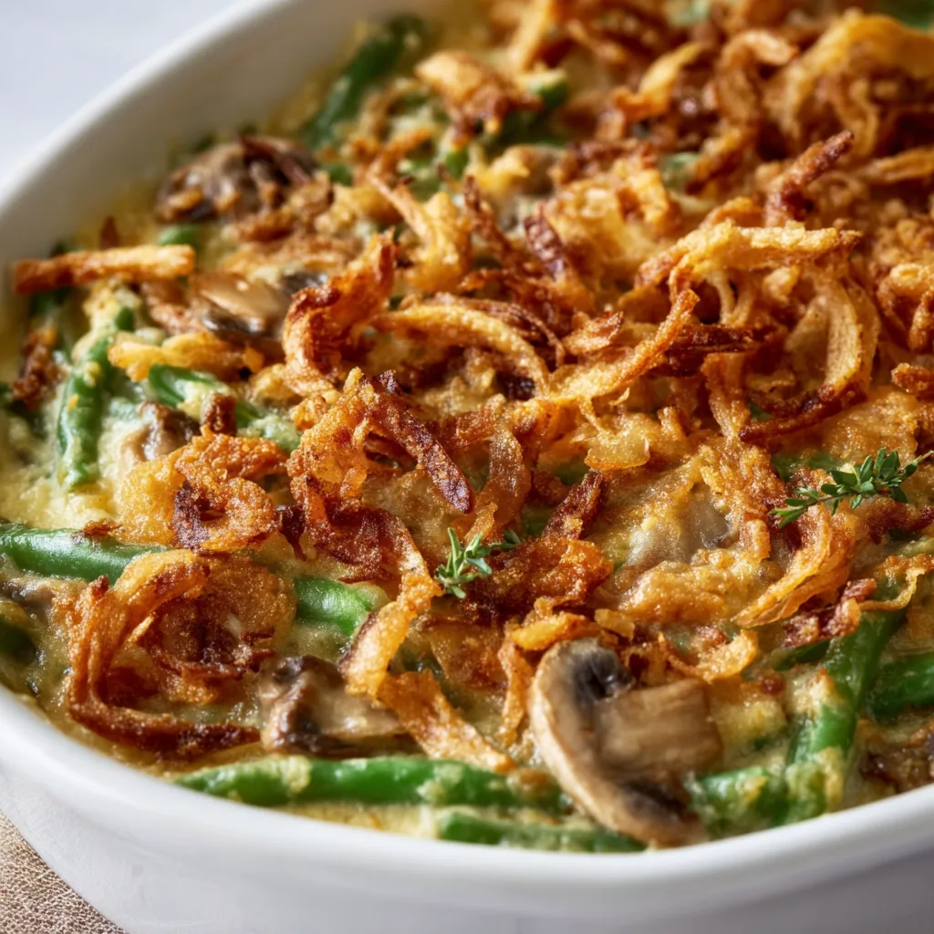 What sets this version apart is the attention to texture and flavor. Fresh green beans are blanched just until tender-crisp, then folded into a silky mushroom cream sauce made with butter, garlic, thyme, and a splash of chicken stock. The sauce is rich without being heavy, thanks to careful seasoning and real ingredients. Topped with crispy fried onions and a sprinkle of Parmesan, the casserole bakes into golden perfection.