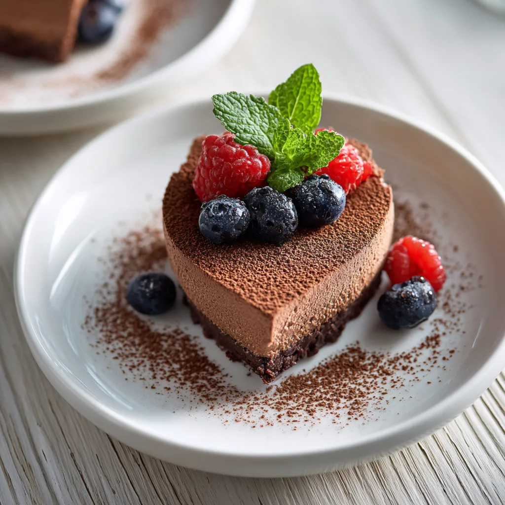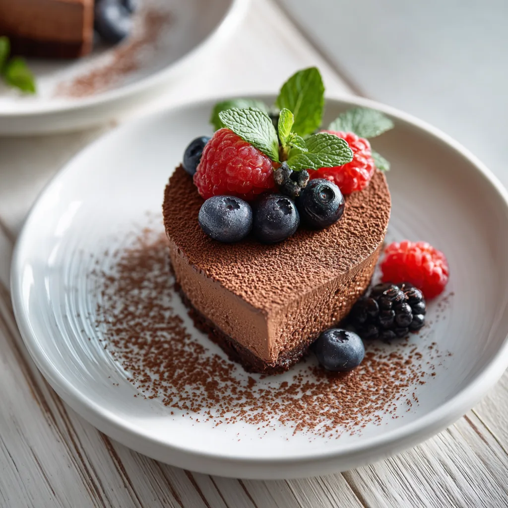 - Before serving, garnish with fresh berries, mint leaves, and a light dusting of cocoa powder. Slice with a sharp knife wiped clean between cuts for the best presentation.