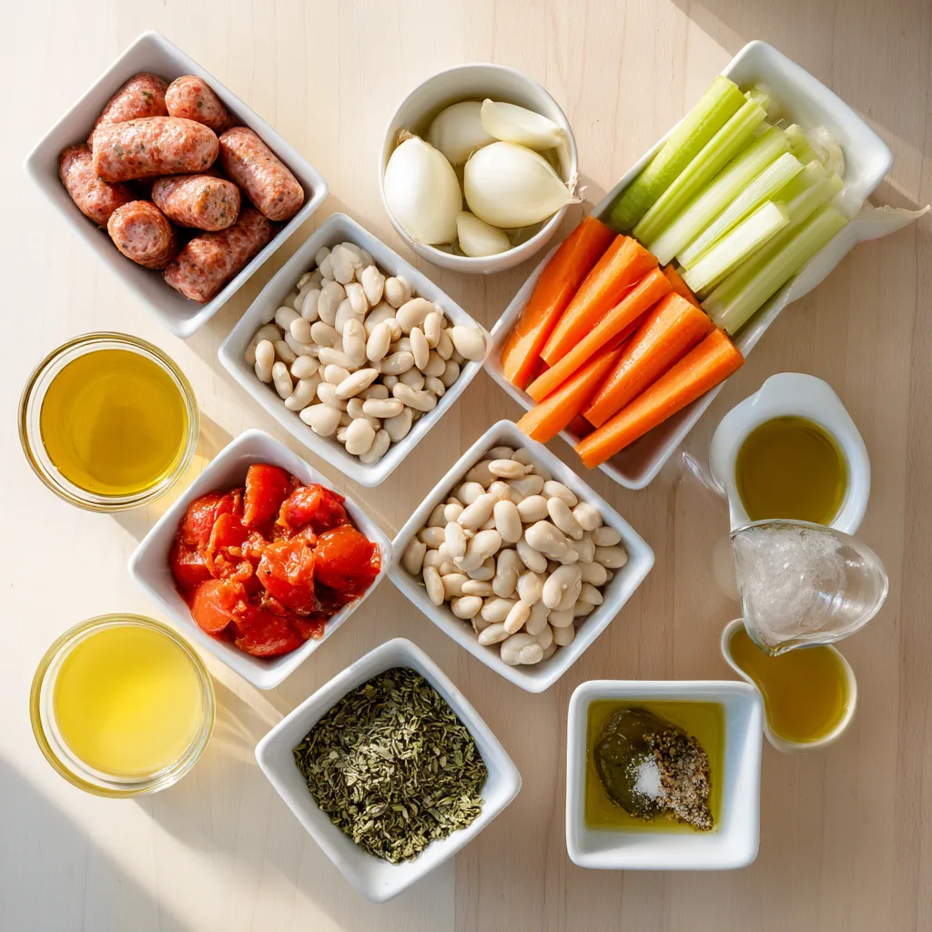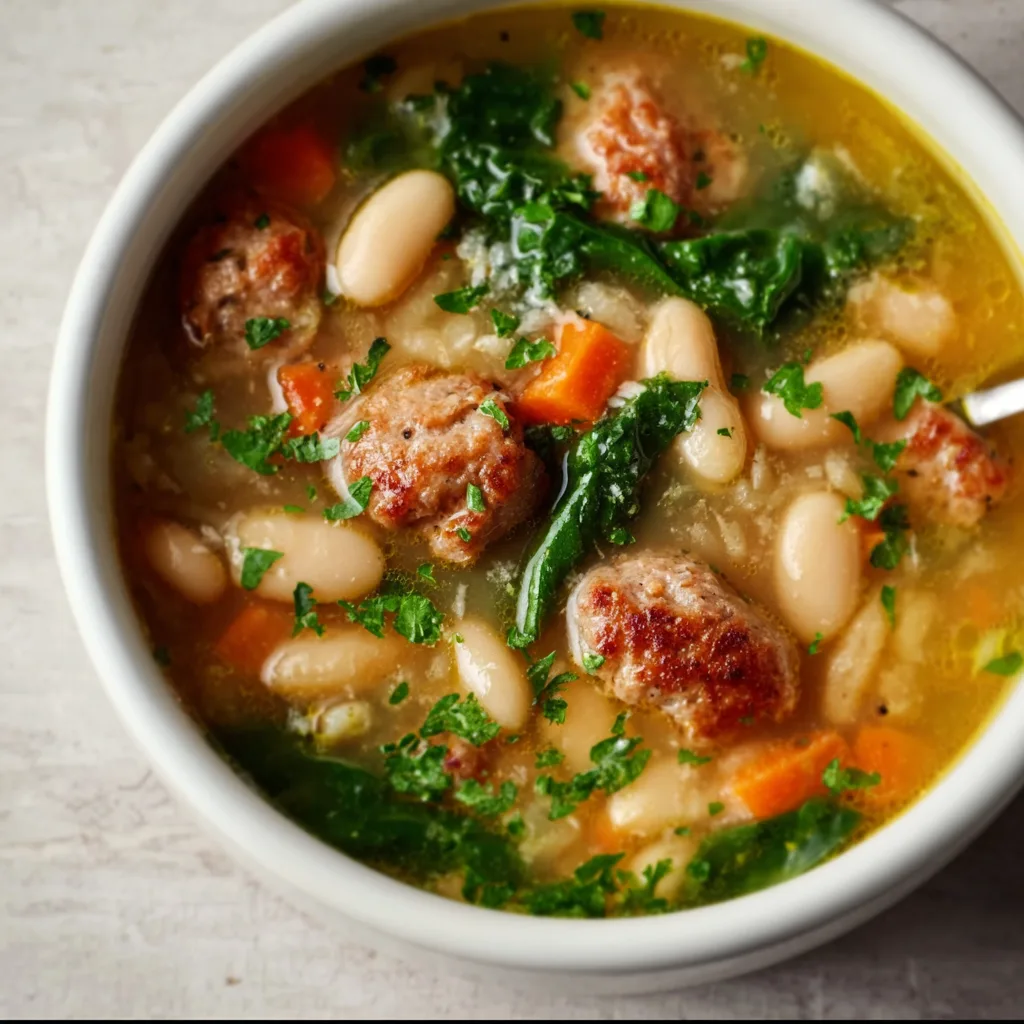 A hearty, cozy Italian-style soup made with savory sausage, tender white beans, vegetables, and herbs simmered in a rich broth.