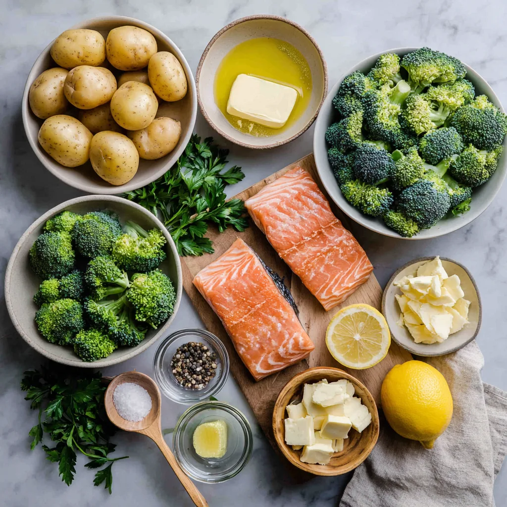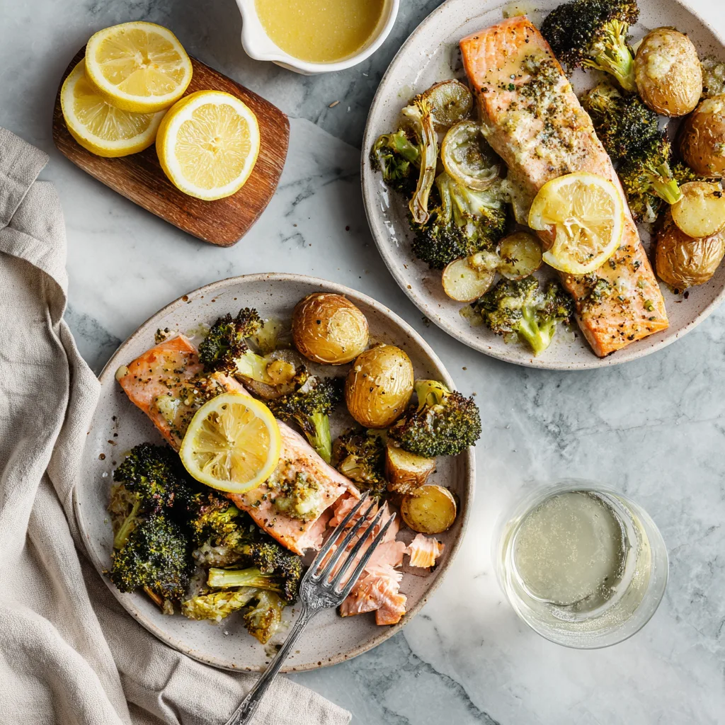 Tender salmon roasted with lemon butter, crispy potatoes, and broccoli for an easy, flavorful dinner.