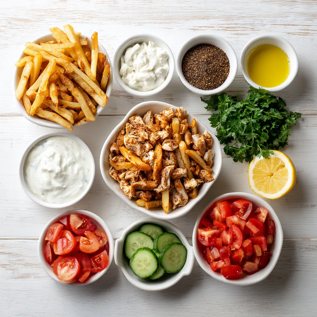 - Prepare garlic sauce and assemble fries with chicken, sauce, and toppings.