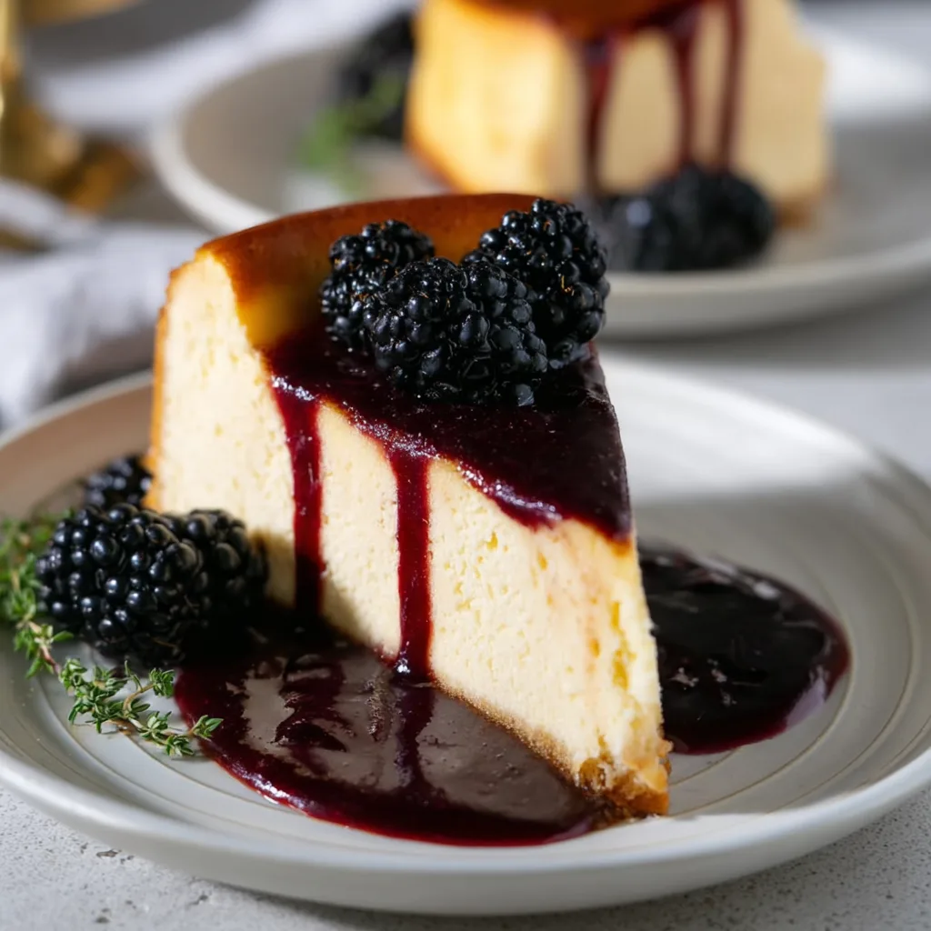 To balance the richness, a simple blackberry sauce is spooned generously over the top. Blackberries bring a tart, jammy brightness that cuts through the creaminess and adds a stunning visual contrast. The deep purple sauce against the golden cheesecake makes this dessert look straight out of a boutique bakery, yet it’s surprisingly easy to make at home.