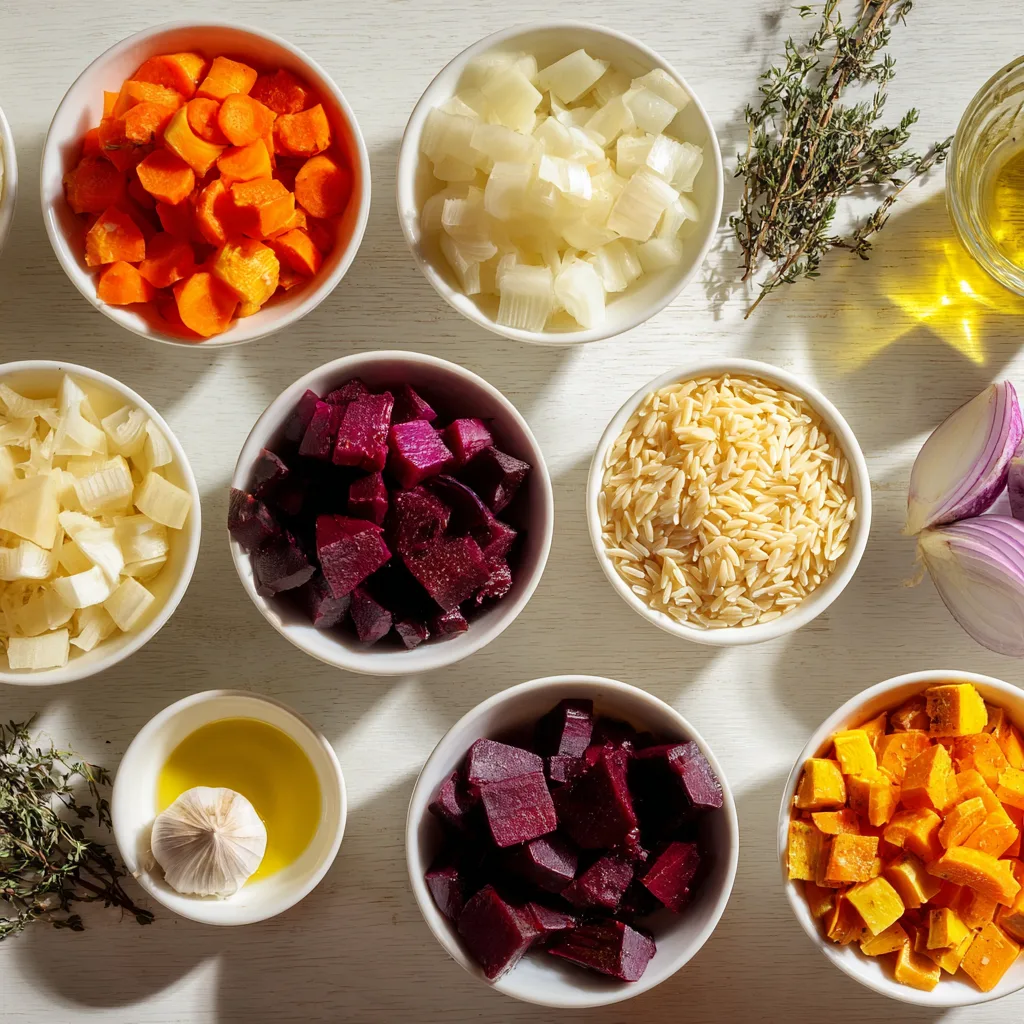 This dish is as vibrant as a fall farmer’s market. Think jewel-toned beets, golden butternut squash, orange carrots, and tender red onions all tumbled through glossy orzo and finished with thyme and a bright squeeze of lemon. It’s hearty enough to stand alone yet elegant enough for company — the kind of meal that makes you pause and appreciate slow, simple cooking.