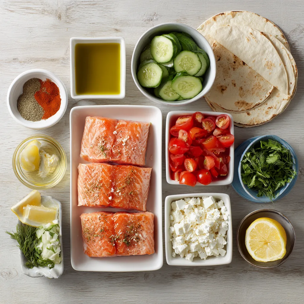 - Assemble the tacos by adding warm salmon to each tortilla. Top with diced cucumber, cherry tomatoes, red onion, crumbled feta, fresh herbs, and a generous spoonful of tzatziki.