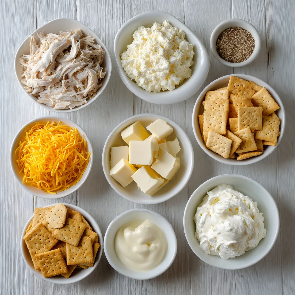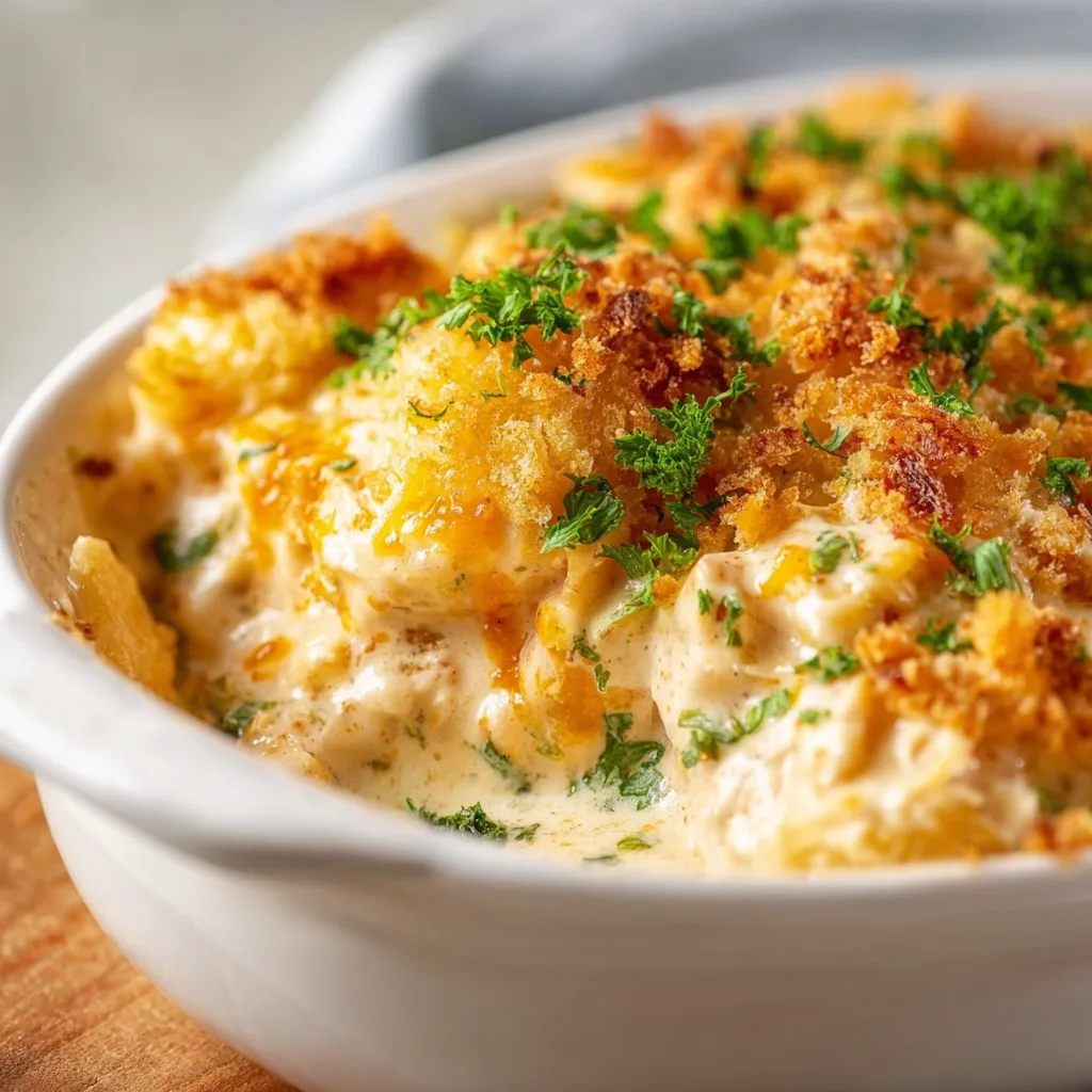 An ultra-creamy chicken casserole with cheese and a buttery cracker topping, perfect for comforting family dinners.