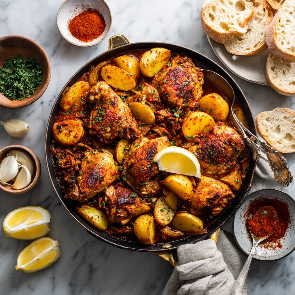 A rustic one-pot meal with golden chicken thighs, tender potatoes, and smoky Spanish-inspired seasonings.