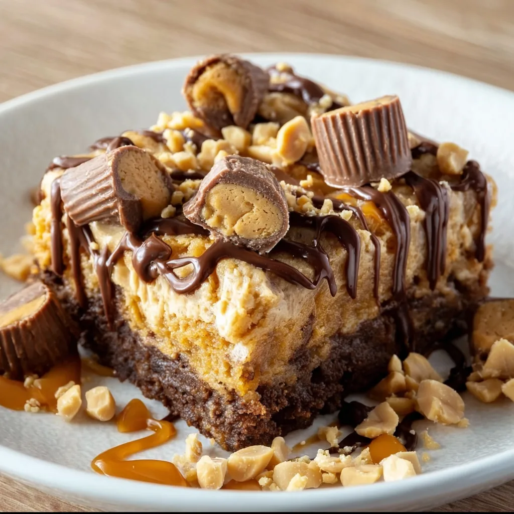 Peanut butter and chocolate is a match made in heaven, and this recipe celebrates it in the most comforting way possible. The gooey layers create contrast with the slightly chewy brownie-like edges, while the chopped peanut butter cups on top provide crunch. Whether you serve it warm with a scoop of vanilla ice cream or let it cool and slice it into bars for a party platter, this cake delivers every single time.