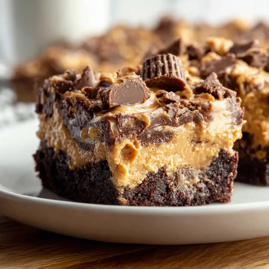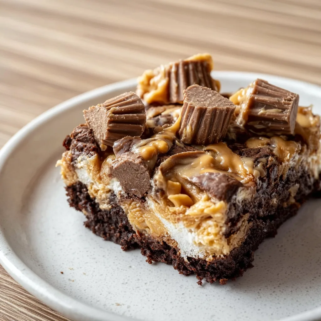 A rich and gooey chocolate cake layered with peanut butter, marshmallow fluff, and peanut butter cups for the ultimate decadent dessert.